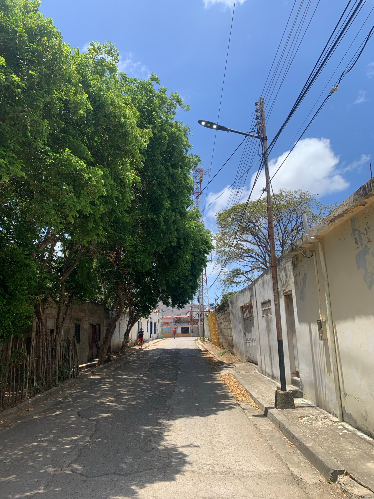 A street scene in Santa Ana, Venezuela, featuring a narrow paved road flanked by buildings. The building on the right is a weathered, multi-story structure with decaying paint and several windows. A t…read more