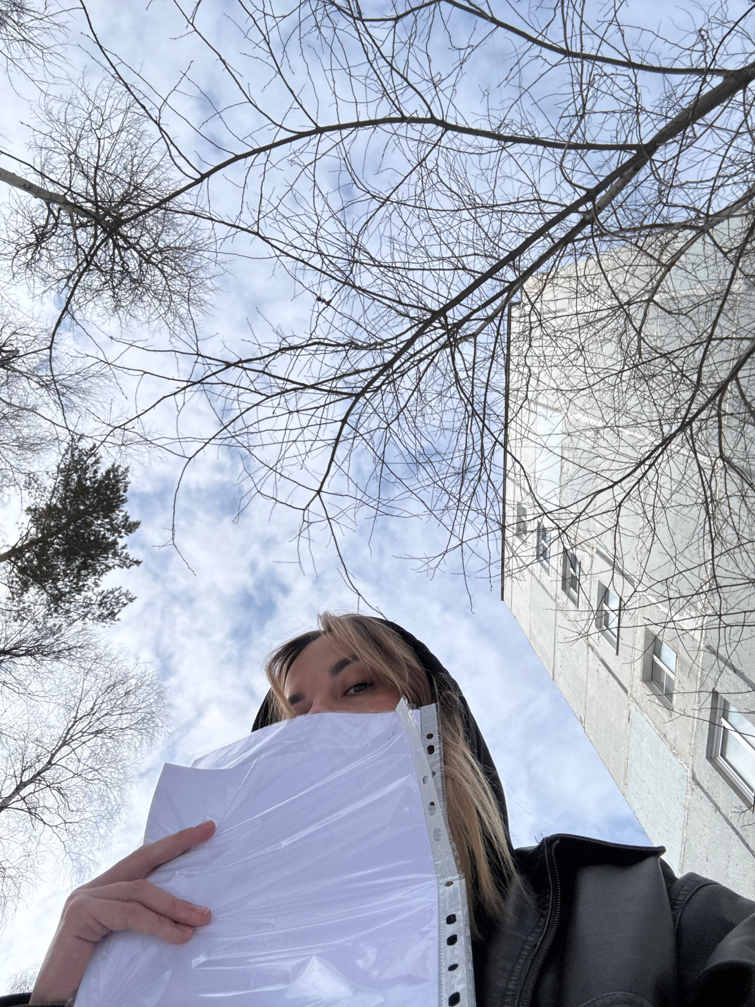 A low-angle shot depicts a blonde-haired person wearing a black hooded jacket holding a stack of papers in a plastic sleeve. The person is positioned in the right side of the frame. Behind the person,…read more