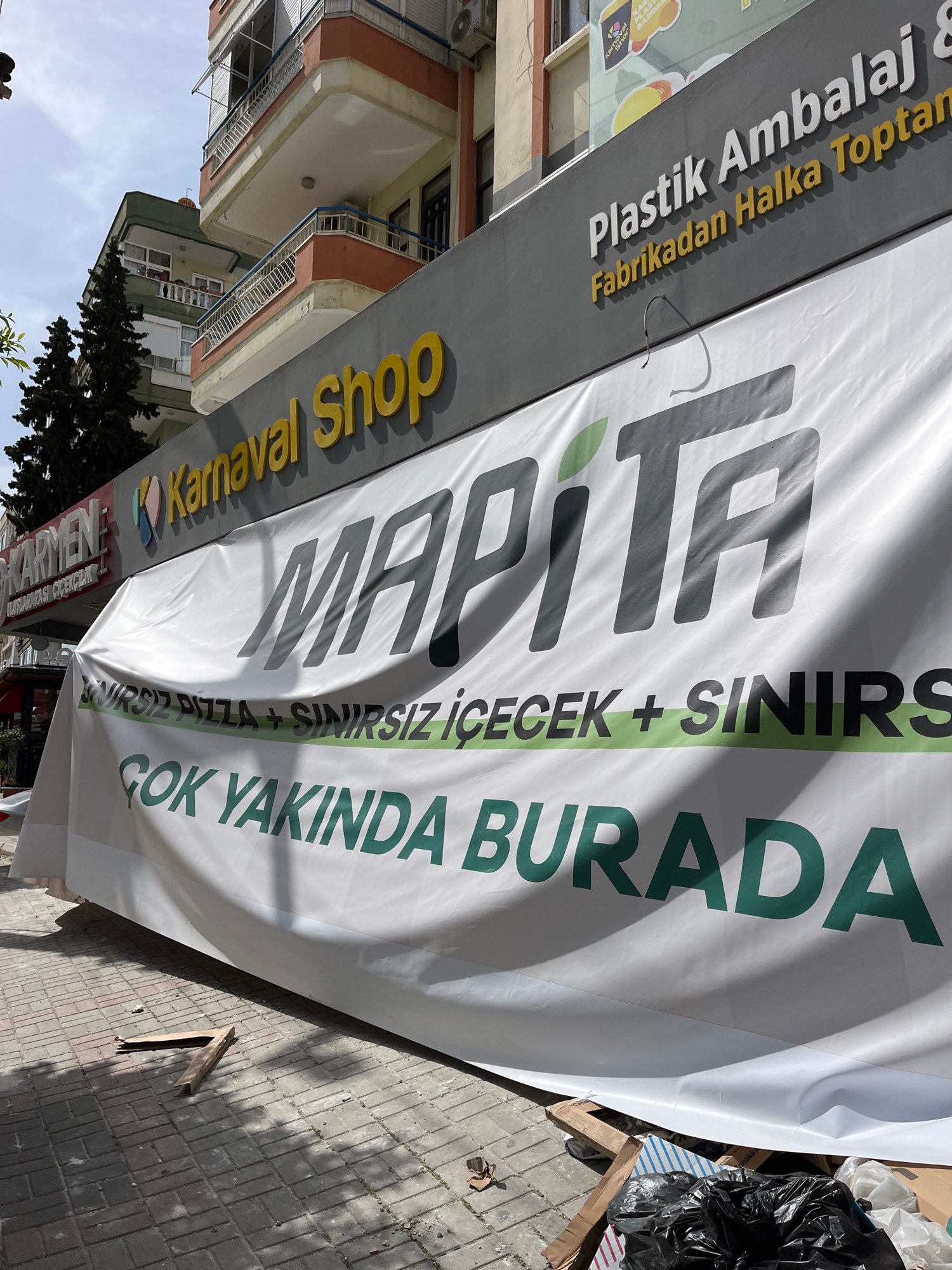 The image shows a banner for "MABITA" with the slogan "ÇOK YAKINDA BURADA" (COMING SOON HERE) and mentions "SINIRSIZ PİZZA & SINIRSIZ İÇECEK + SINIRSIZ" (UNLIMITED PIZZA & UNLIMITED DRINKS + UNLIMITED…read more