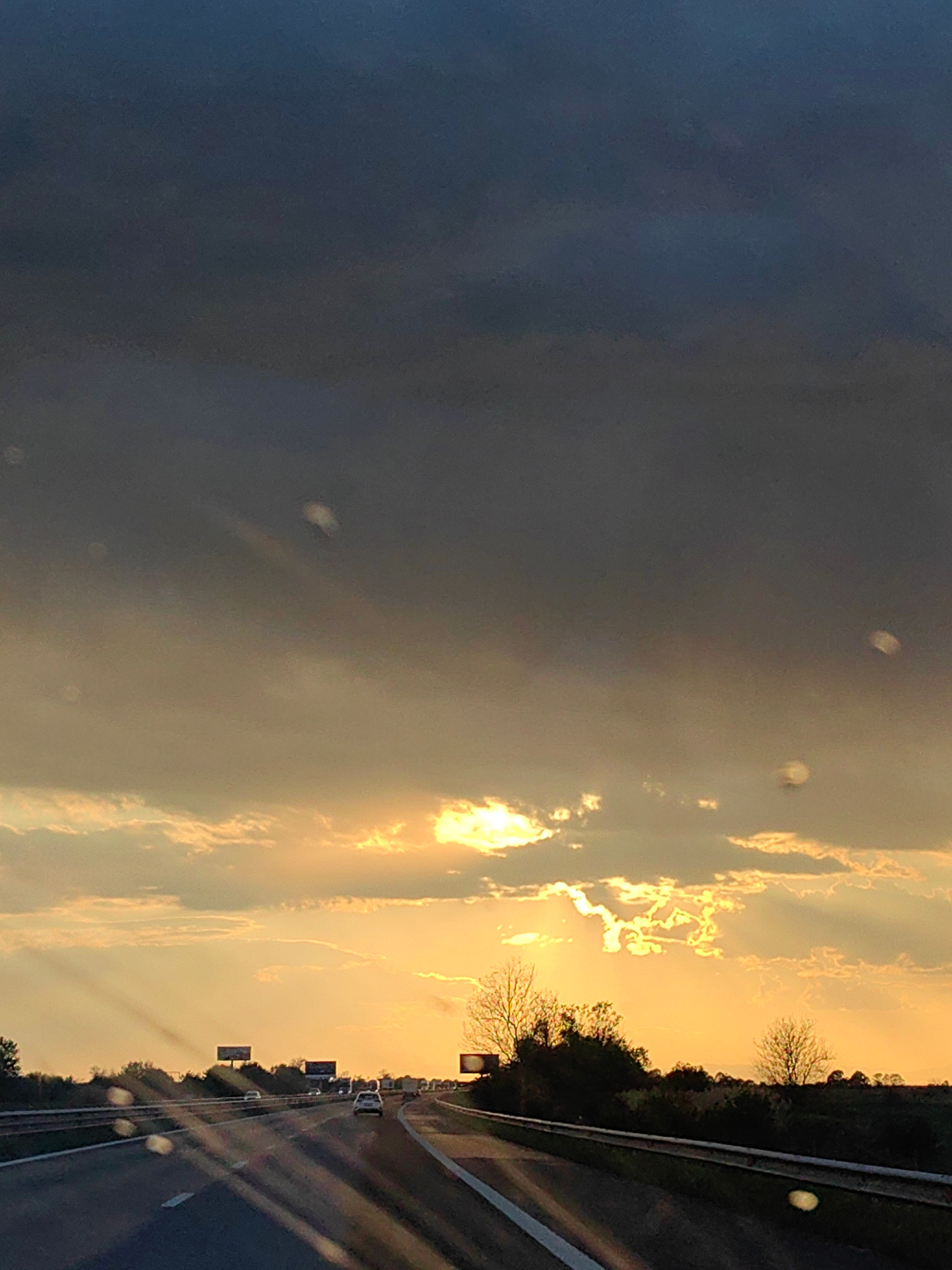 The image depicts a highway scene at sunset, possibly taken from a moving vehicle. The sky is dominated by dark, heavy clouds above, with a lower layer of golden-hued clouds being illuminated by the s…read more