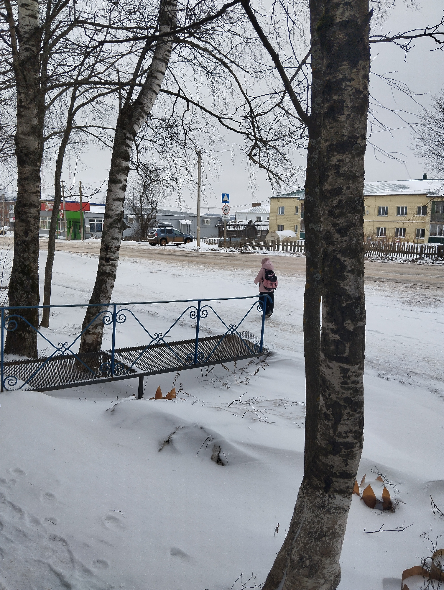 The image captures a winter scene in what is identified as Krasnogorskoye, Russia. A child wearing a pink jacket and a black backpack is walking along a snow-covered roadside. A metal pedestrian bridg…read more