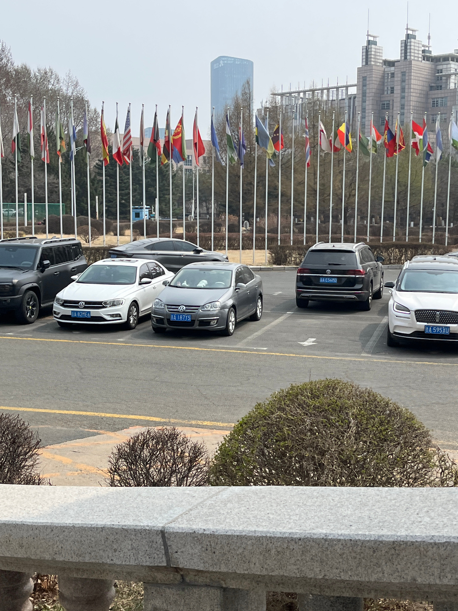 The image depicts a parking lot in Changchun City, China, with several cars parked in marked spaces. Adjacent to the parking lot are numerous flagpoles displaying various international flags. In the b…read more