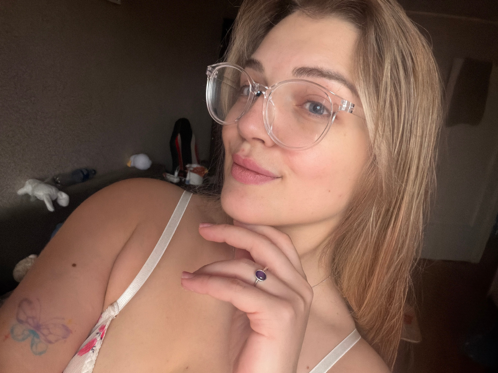 A close-up, angled shot shows a person with blonde hair and glasses. The person is wearing what appears to be a light-colored bra or top with thin straps. A ring with a purple stone is visible on one…read more