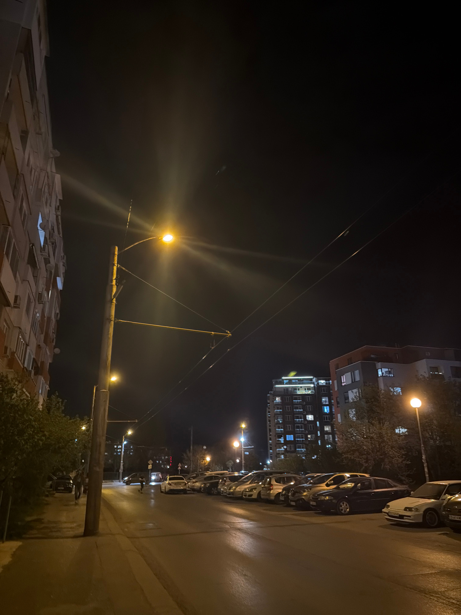 The image depicts a night scene in Sofia, Bulgaria. A street is lined with parked cars on the right side. Buildings with lit windows are visible in the background and at the bottom of the frame. Sever…read more