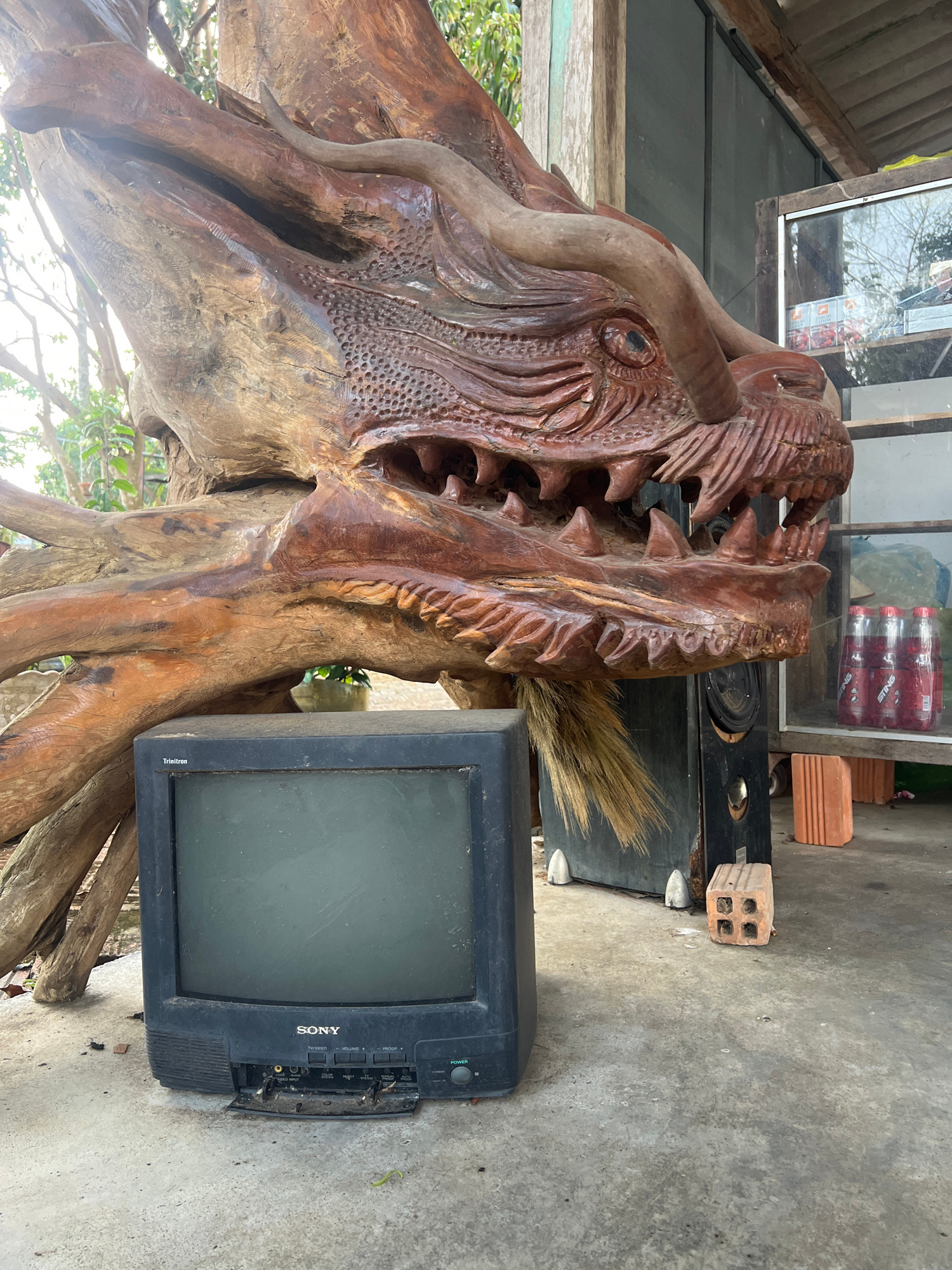 A Sony Trinitron CRT television sits on the ground next to a large, carved wooden sculpture in what appears to be an outdoor area. The sculpture resembles a dragon or mythical creature with prominent…read more