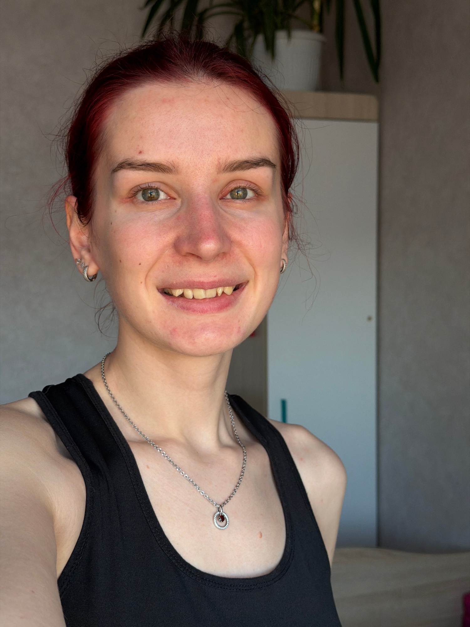 A fair-skinned person with reddish hair, likely female, is smiling and looking at the camera. She is wearing a black tank top and a silver necklace with a circular pendant. The setting appears to be i…read more