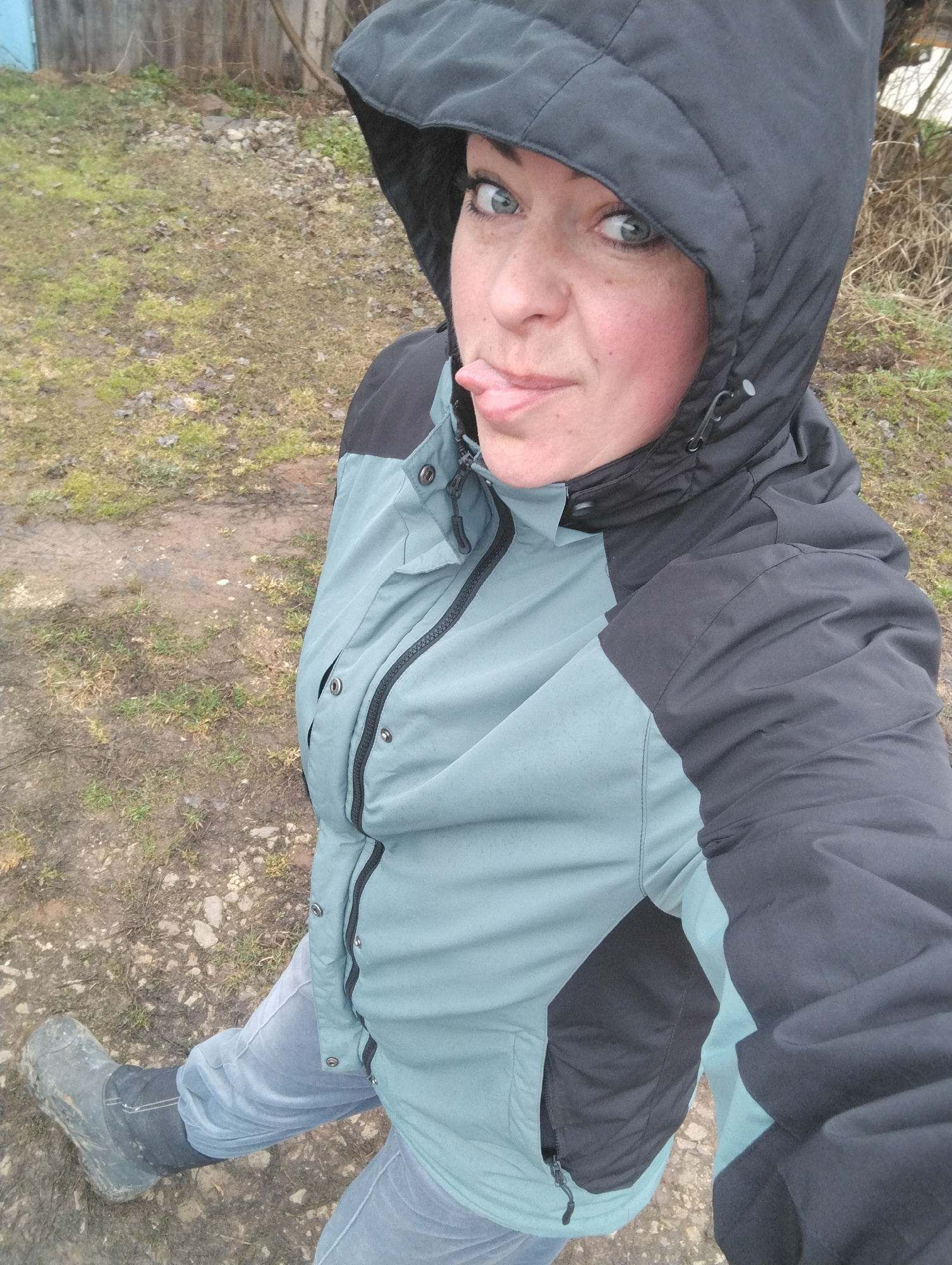An adult woman is captured in a self-portrait outdoors, seemingly in Grishanki, Russia. She is shown from the waist up, angled slightly from the left, looking directly into the camera. Her expression…read more