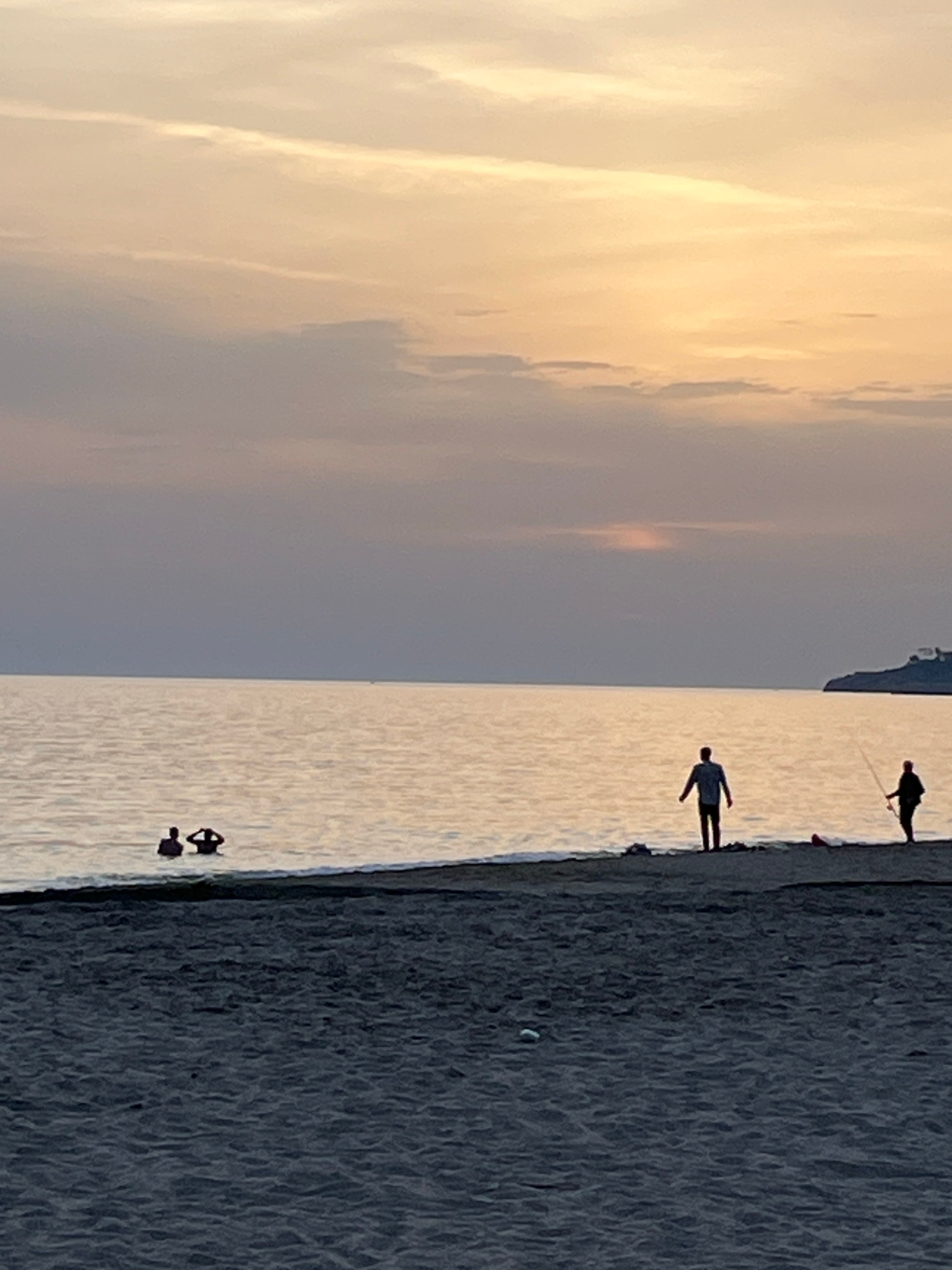 The image depicts a beach in Alanya, Turkey, during sunset. The sky, a blend of orange and gray, reflects on the calm water surface. Three dark silhouettes of individuals are visible: one near the topβ¦read more