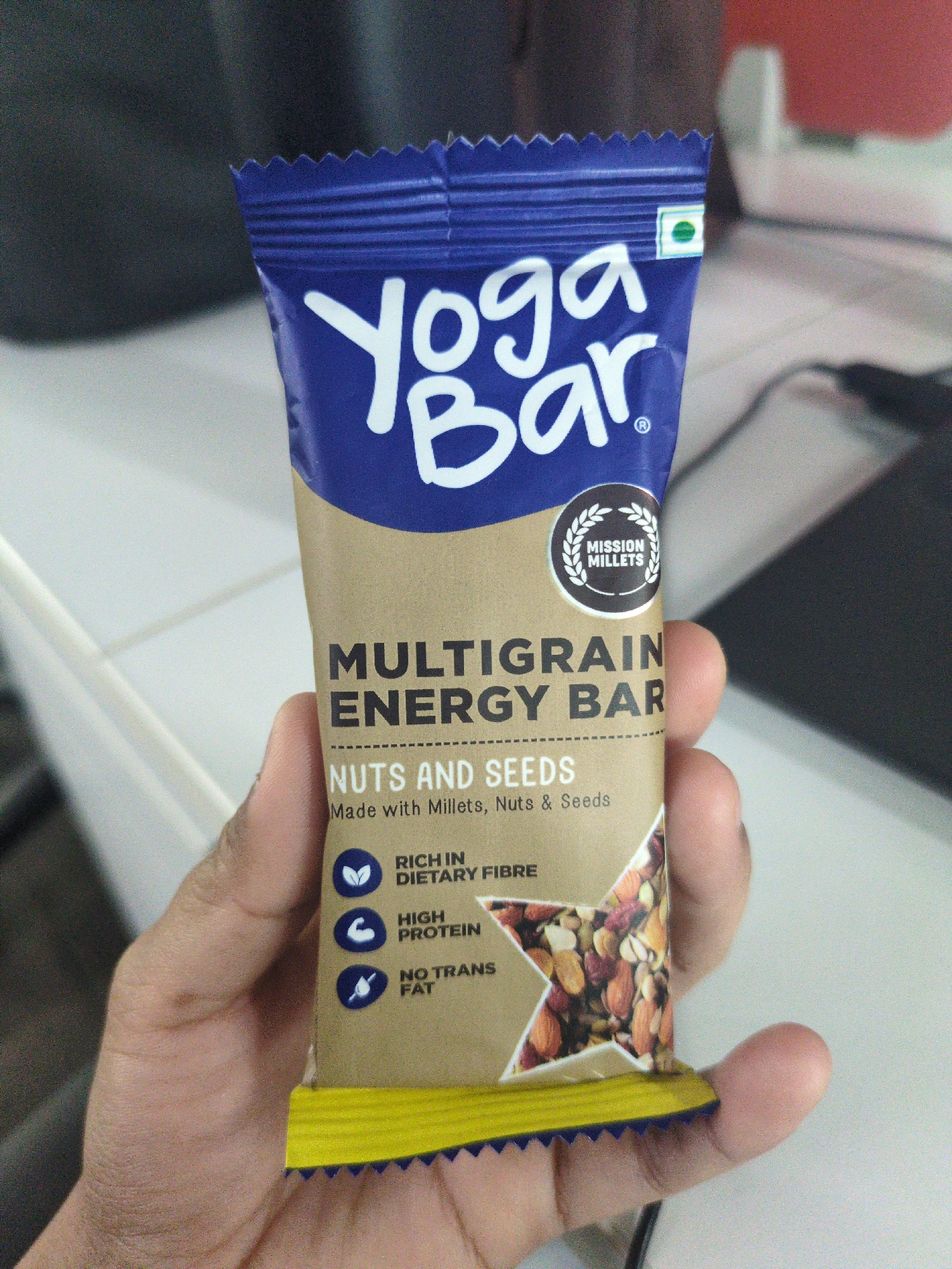 A hand holds a Yoga Bar multigrain energy bar. The bar has a blue and tan wrapper with a yellow end. The wrapper reads "Yoga Bar," "Multigrain Energy Bar," "Nuts and Seeds," "Mission Millets," "Rich i…read more