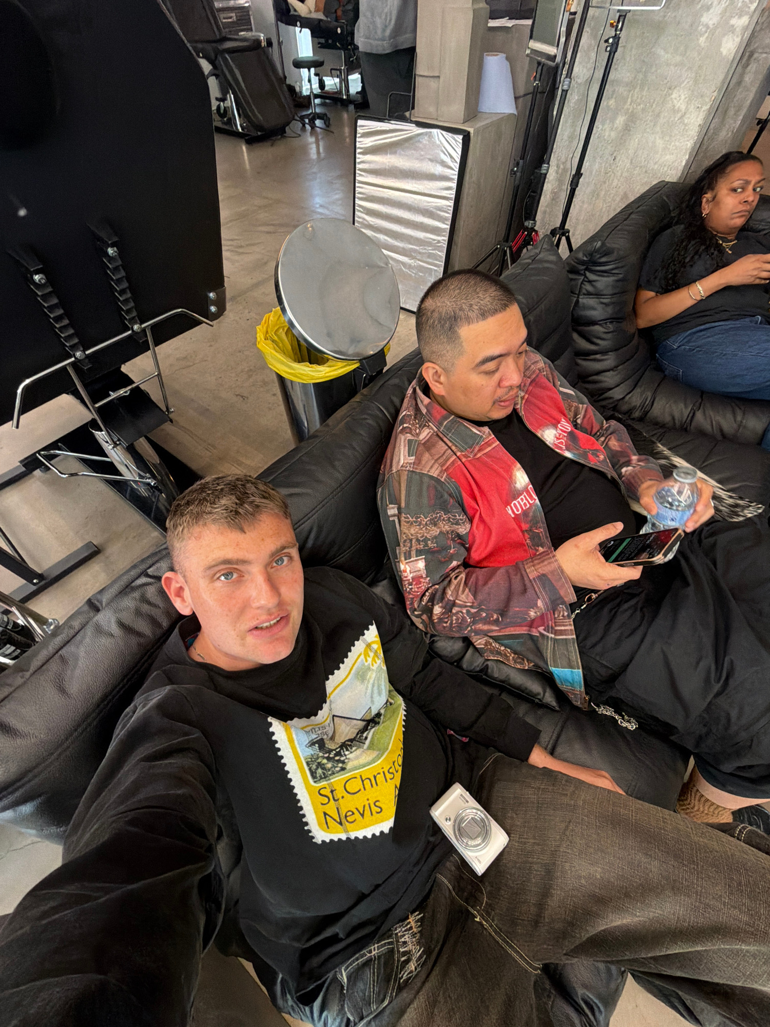 This rotated image captures three individuals relaxing on black leather seating in an indoor setting, likely a studio or lounge area in London, United Kingdom. In the background, a woman with long, d…read more