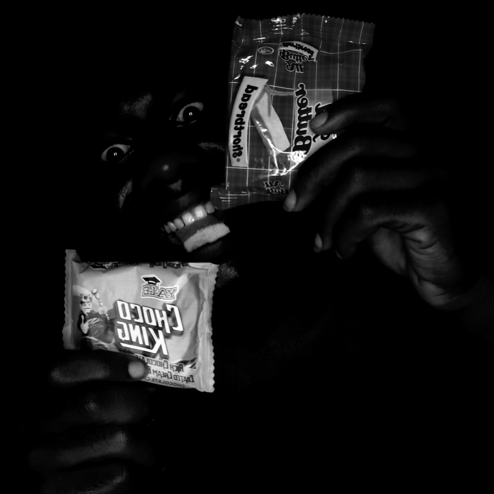 The image is a black and white photograph of a person with dark skin holding two packages of candy near their face. One package is labeled "Butter Sports" and the other "King Choco." The person is loo…read more