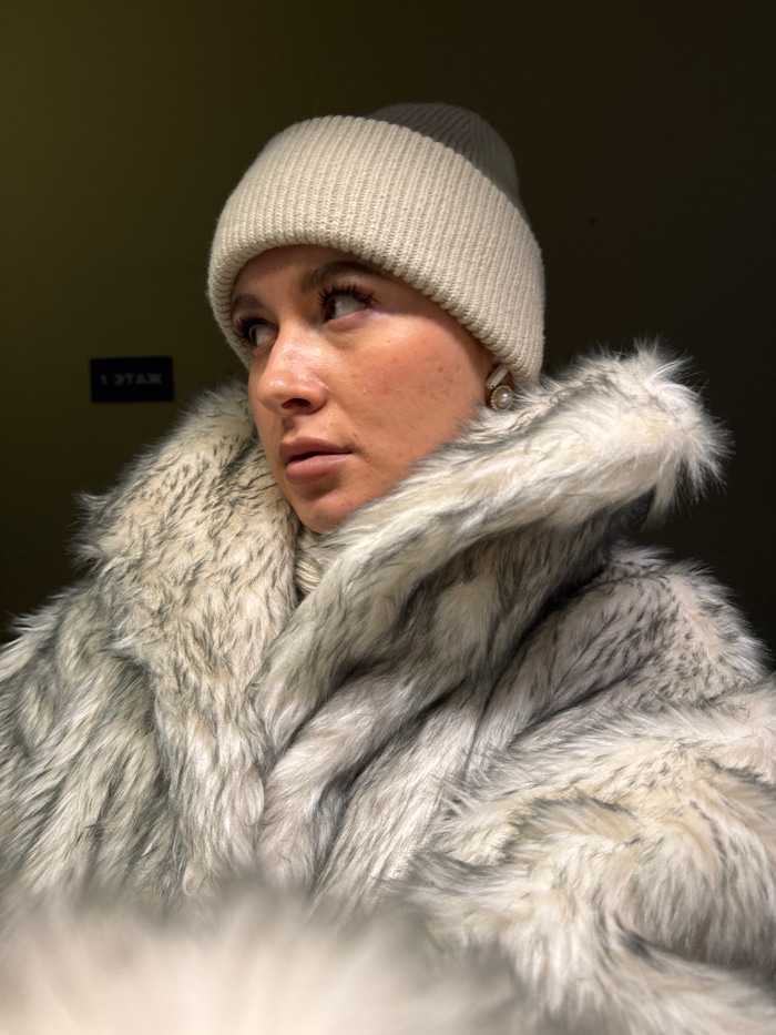 A female subject is depicted in a chest-up portrait within a dimly lit interior environment, located in Odintsovo, Russia. The subject wears a light beige ribbed knit beanie and a faux fur coat featur…read more