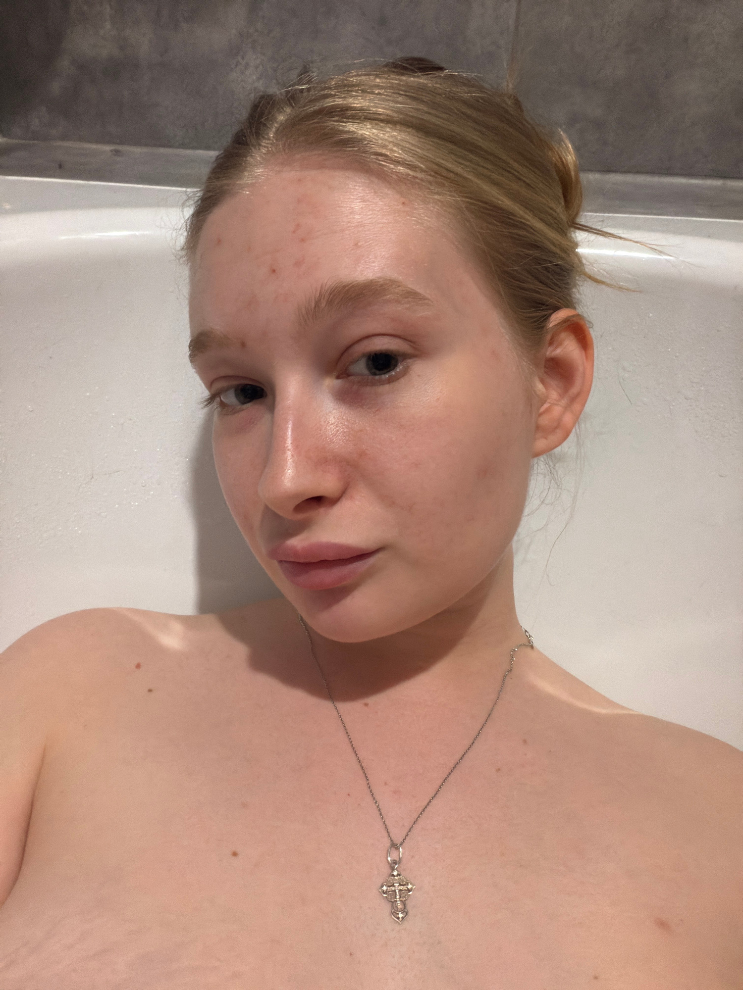 The image displays a young individual, likely female, with light blonde hair and fair skin, lying down in what appears to be a bathroom setting. The photograph is oriented on its side, showing the sub…read more