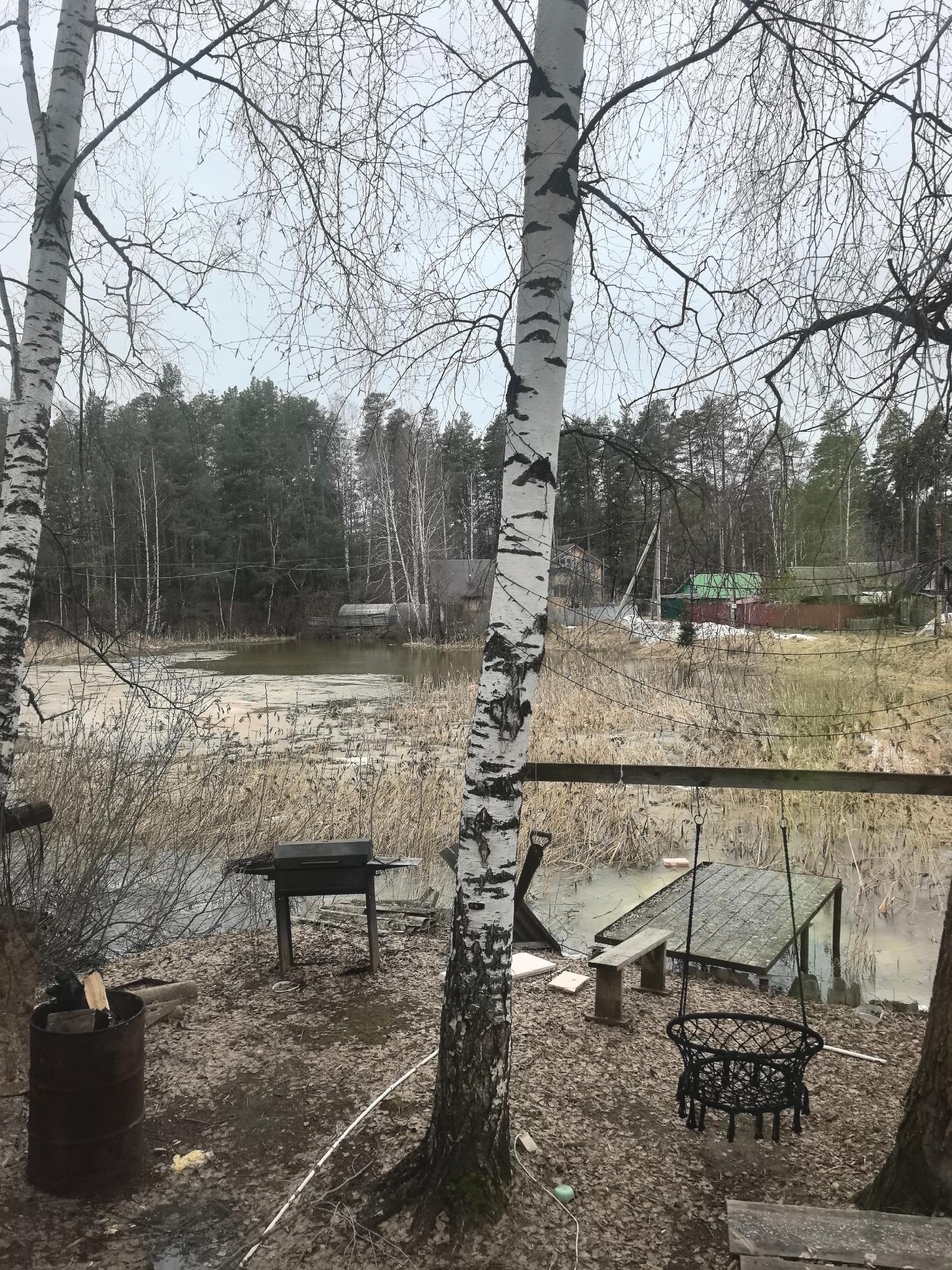 The image shows a rural lakeside setting in what appears to be early spring or late autumn. The location is inferred to be near Noviy, Russia, based on the provided information. A narrow body of water…read more