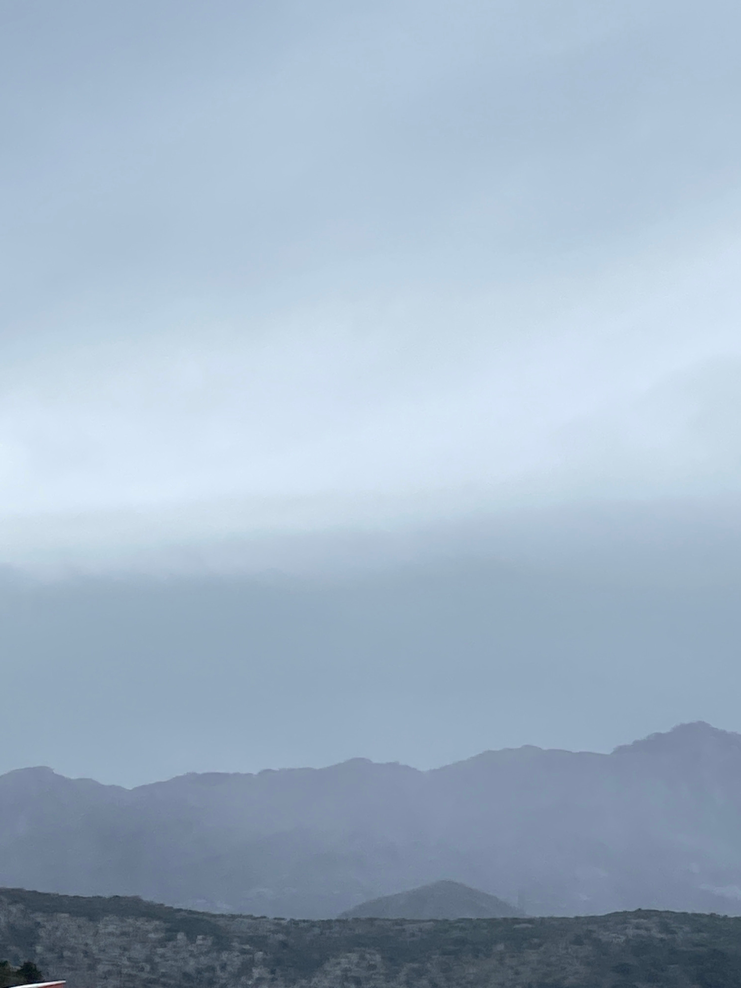 A landscape oriented photograph captures a mountain range on a cloudy, overcast day. The mountain range is to the right, its silhouette defined by the gray sky. The terrain is rocky and textured, with…read more