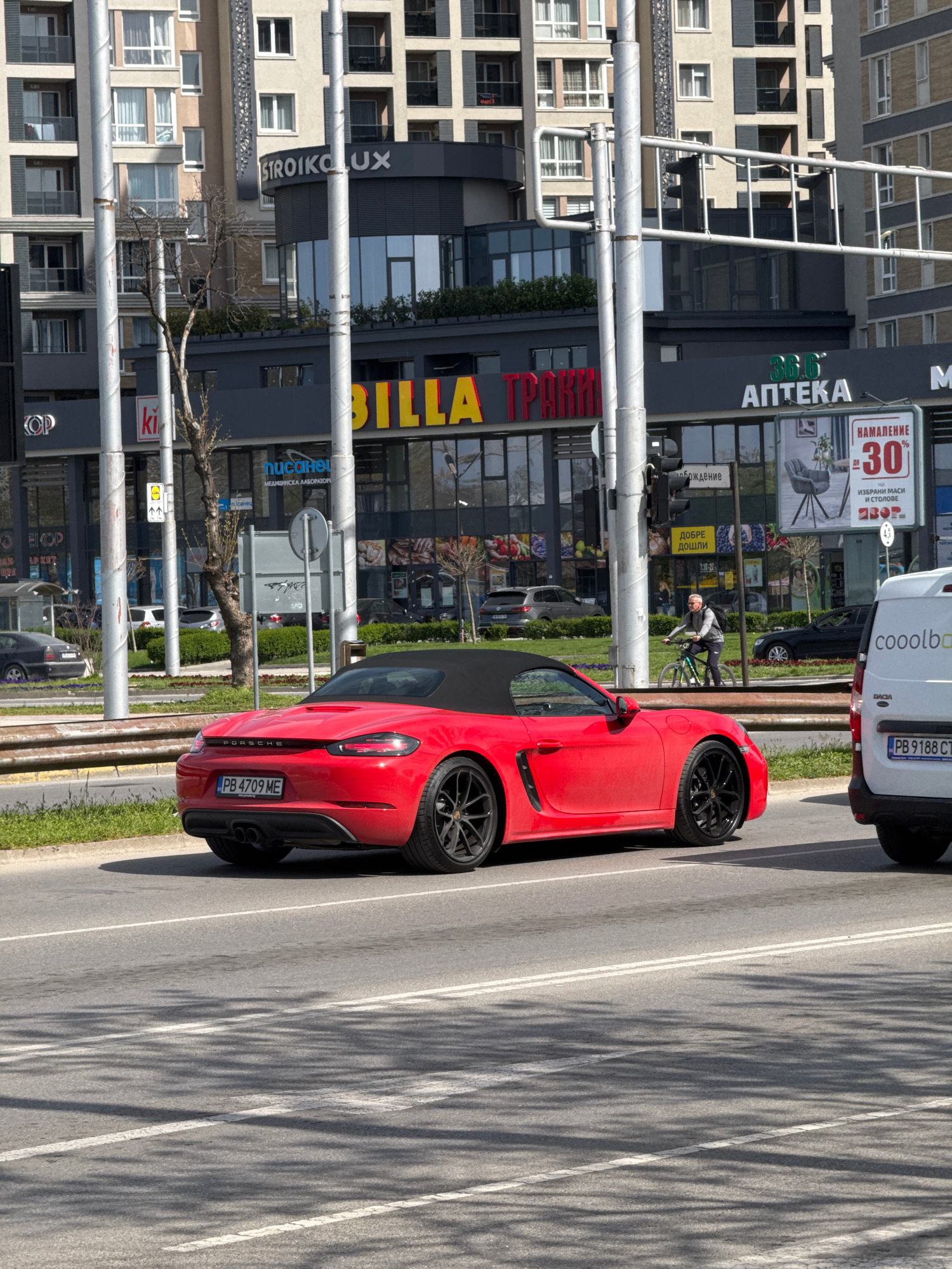 This image depicts an urban street scene in Plovdiv, Bulgaria, on a bright, sunny day. The central subject is a striking red Porsche convertible, identifiable by the "PORSCHE" emblem on its rear and t…read more