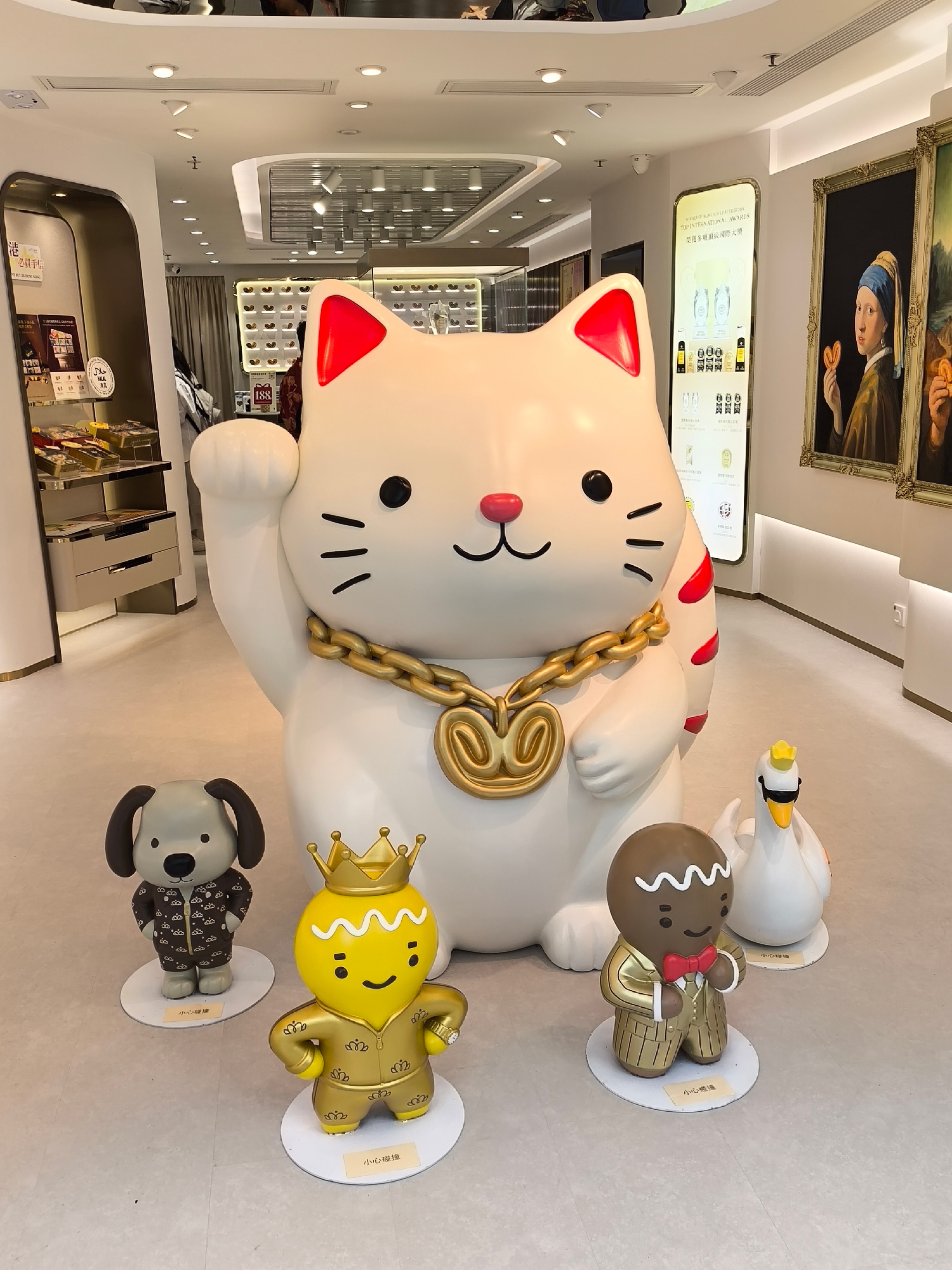 The image shows a brightly lit interior, possibly a shop in Hong Kong, China, given the presence of Chinese characters on small signs at the base of the figures and on a display in the background. Th…read more