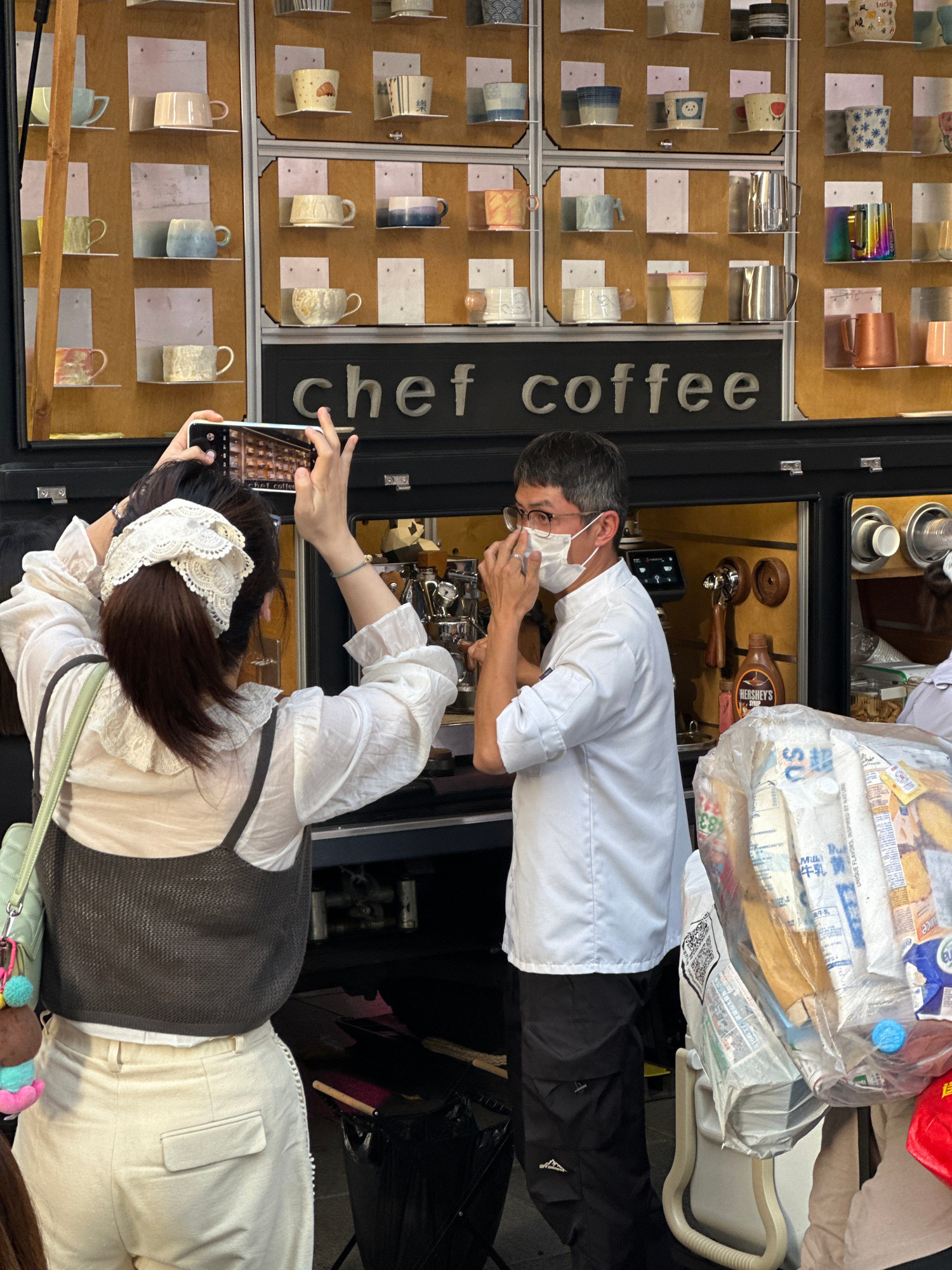 This daytime image captures a vibrant scene at an outdoor or semi-outdoor coffee stand in Yuzhong District, China. A male barista, wearing a white chef's coat and a face mask, is diligently preparing…read more