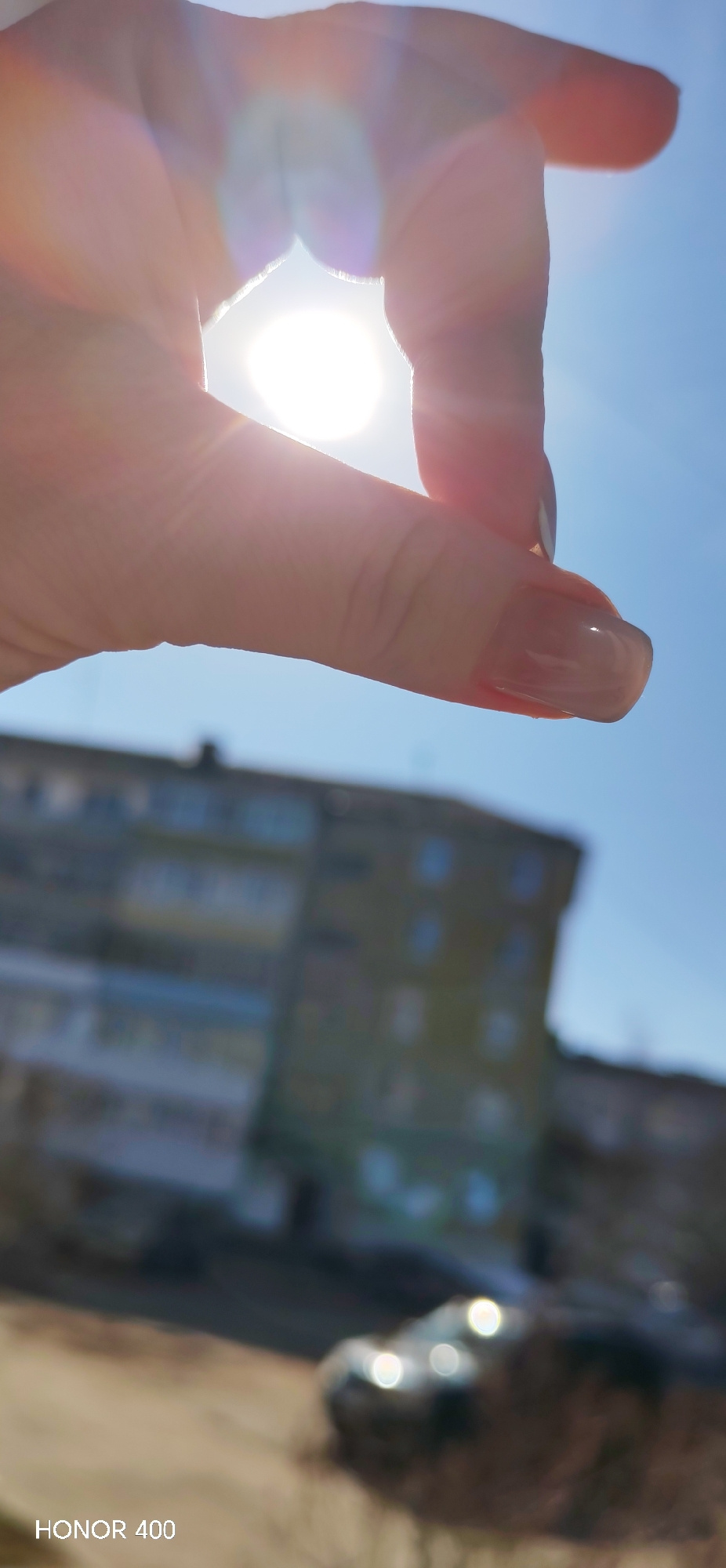 A hand is holding the sun, partially obscuring the light with the tips of the thumb and forefinger, against a blue sky. In the background, out of focus, is an apartment building and a car. The image w…read more