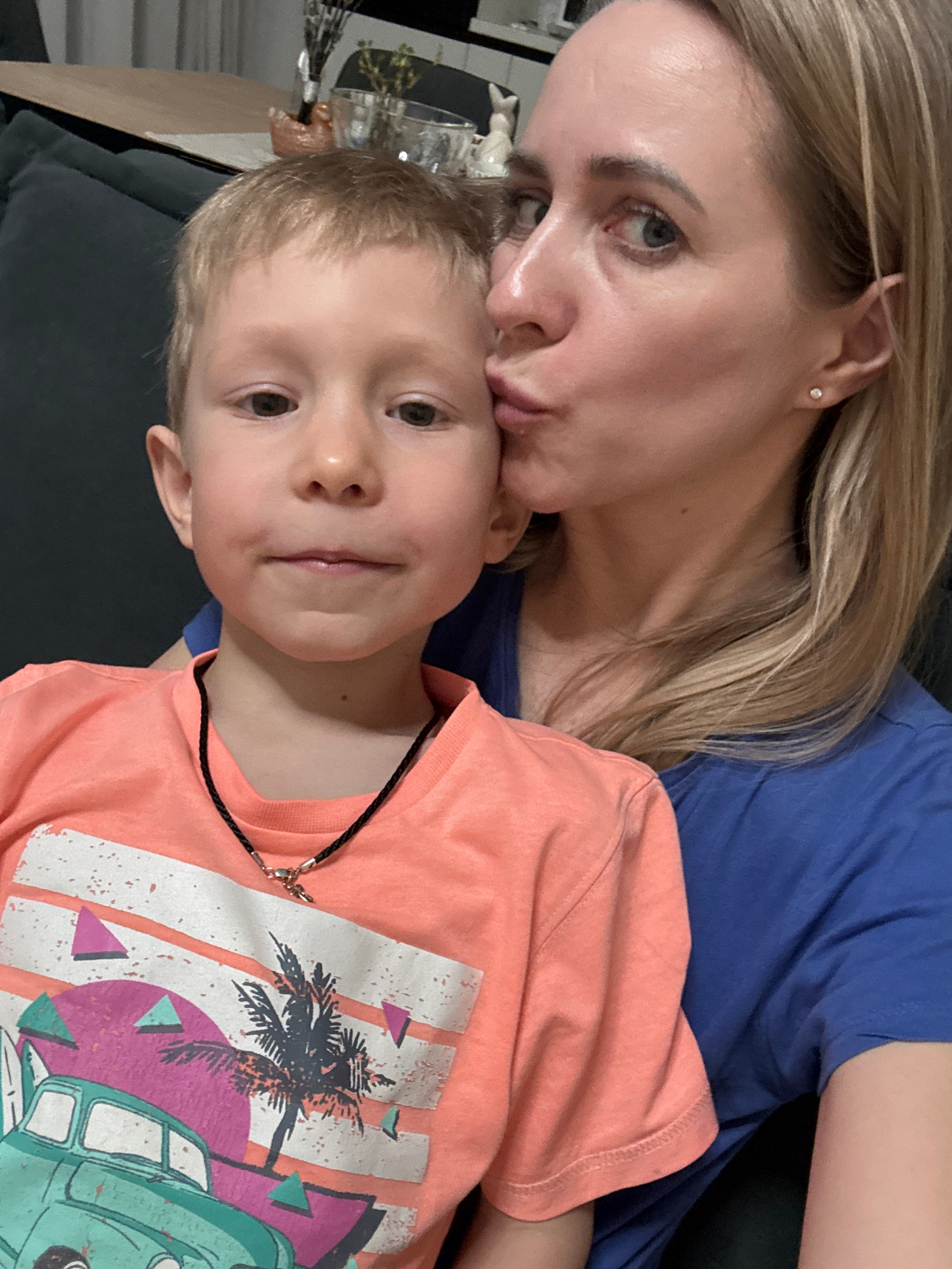 A woman with blonde hair is kissing the forehead of a young boy wearing a coral-colored t-shirt with a palm tree and van design. The woman is wearing a blue shirt. They are likely inside, possibly sit…read more