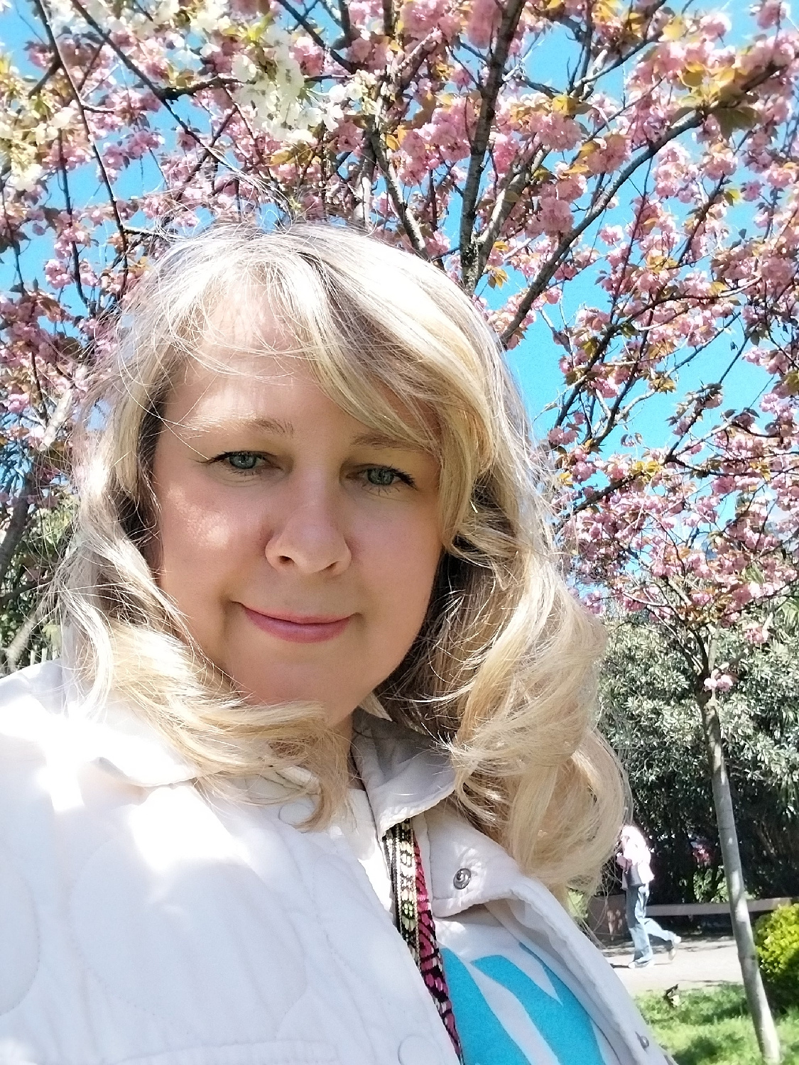 A blonde woman is featured in a close-up, rotated portrait, likely a selfie taken outdoors. She has light skin, light blue eyes, and is looking towards the camera with a subtle smile. Her long, wavy b…read more