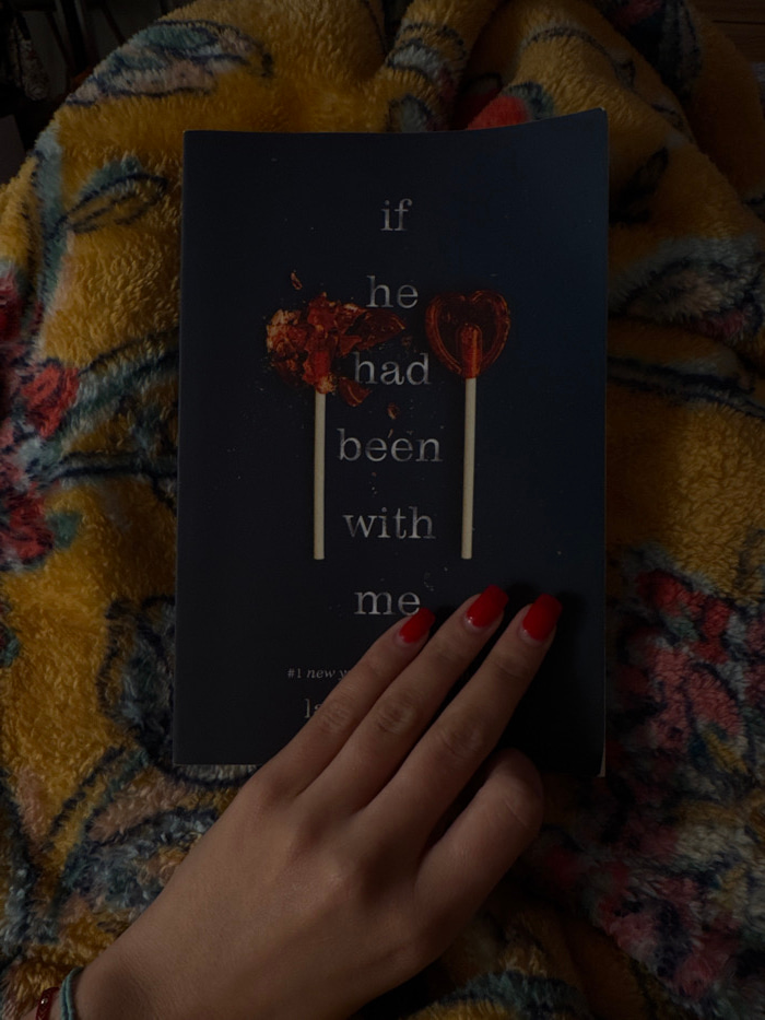 The image presents an overhead view of a dark-covered book titled "if he had been with me," resting on a yellow-orange patterned fuzzy blanket. The book's cover art depicts two lollipops with sticks:…read more