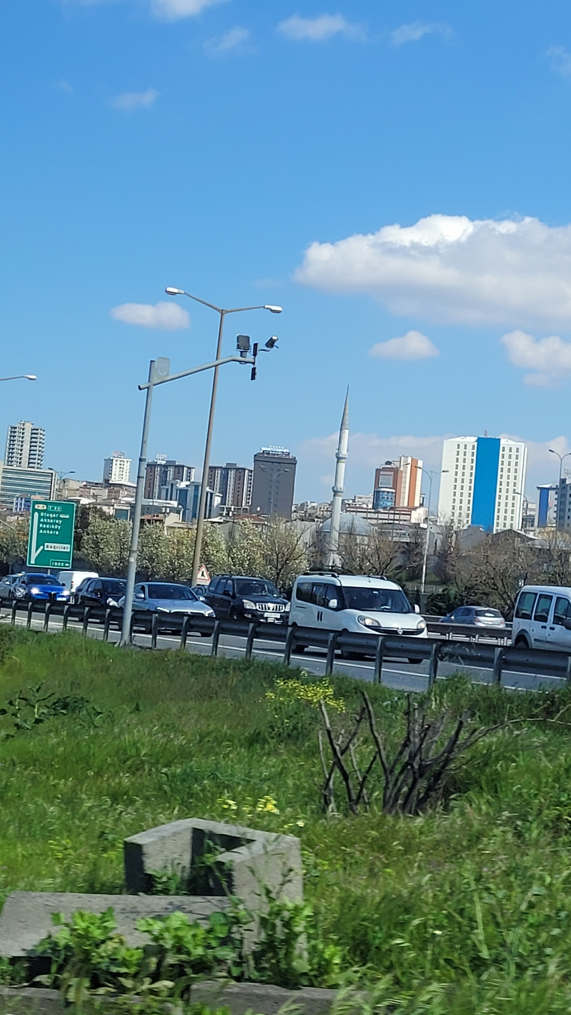 The image captures a view in Bağcılar, Turkey, likely taken from a moving vehicle. It shows an urban environment with a highway running alongside grassy terrain on the right side. Several vehicles are…read more