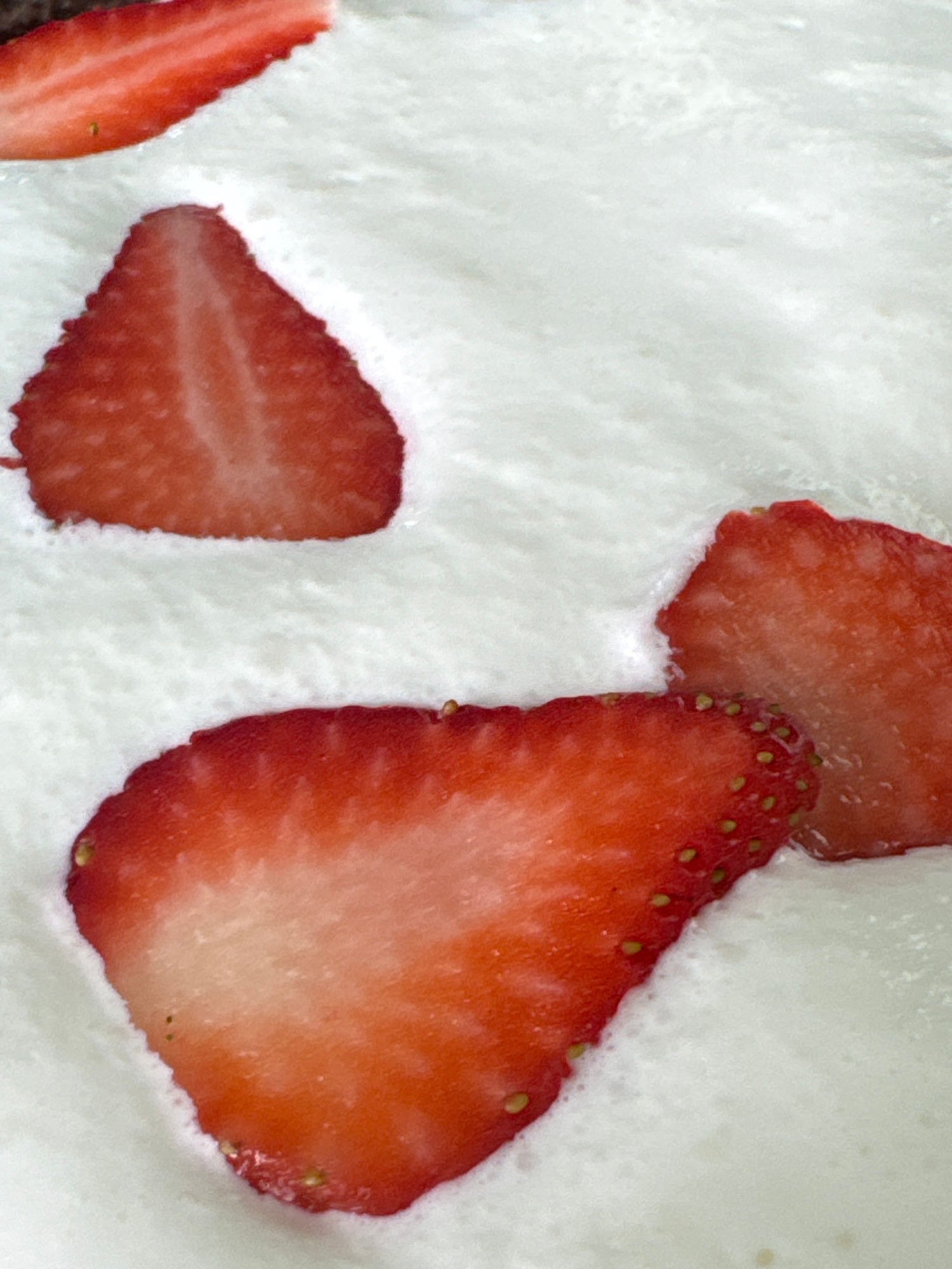 A close-up photograph shows sliced strawberries on top of a white, textured surface resembling whipped cream or frosting. Four strawberry slices are visible, each cut in half to reveal the interior. T…read more