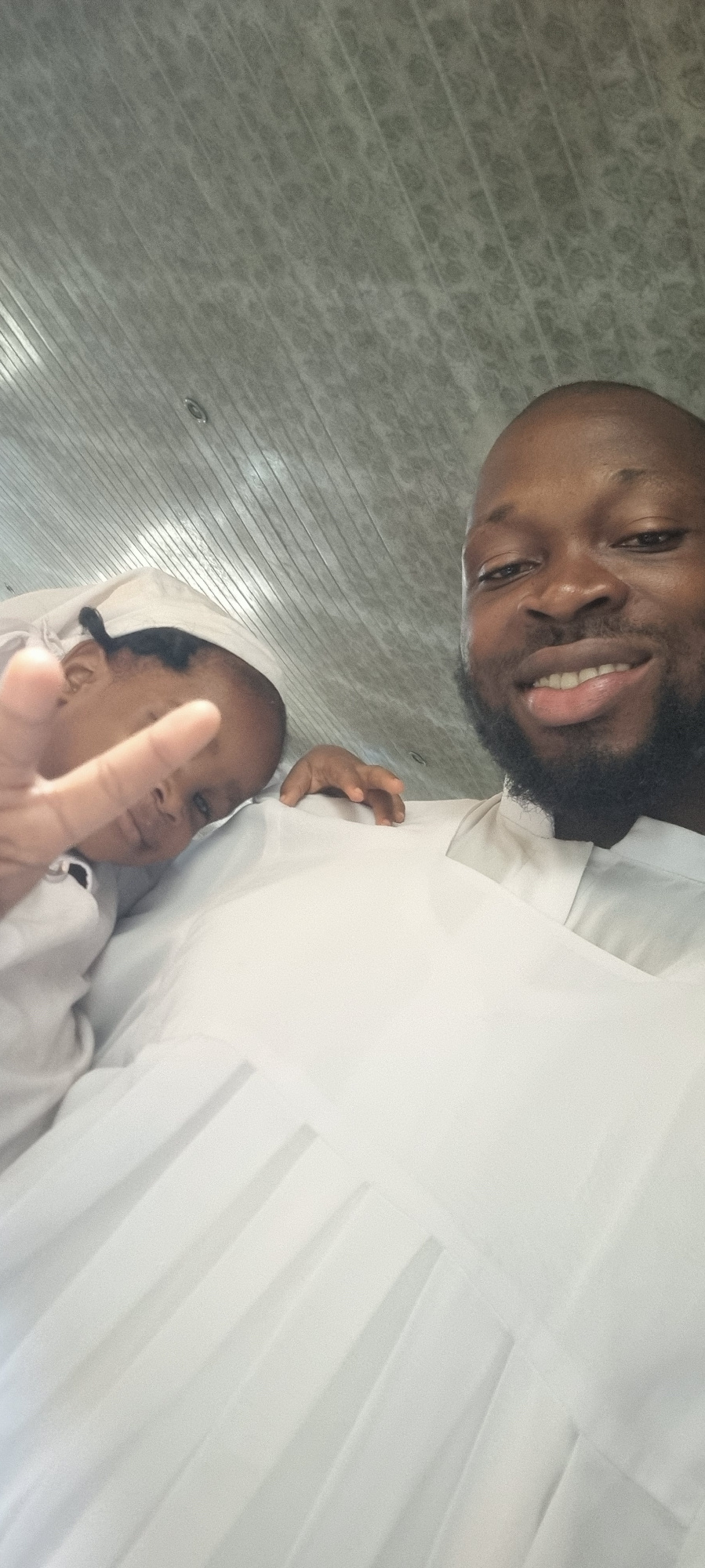A man with a beard is smiling at the camera, holding a baby. The baby is making a "peace" sign with its fingers. Both are wearing white clothing. The setting appears to be indoors, possibly a home in…read more
