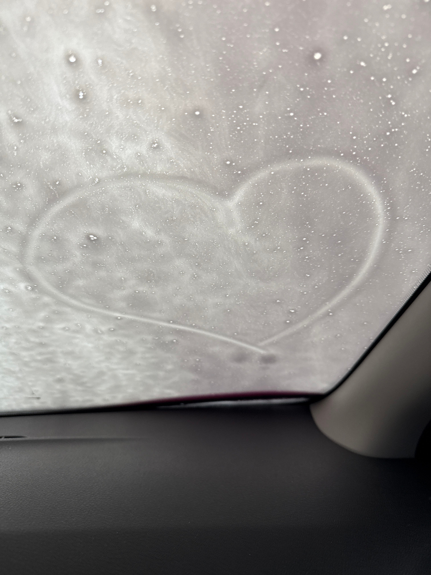 The image presents a close-up view from inside a car, looking out through a windshield covered in a layer of soap suds or water droplets. A distinct heart shape has been playfully drawn or wiped into…read more