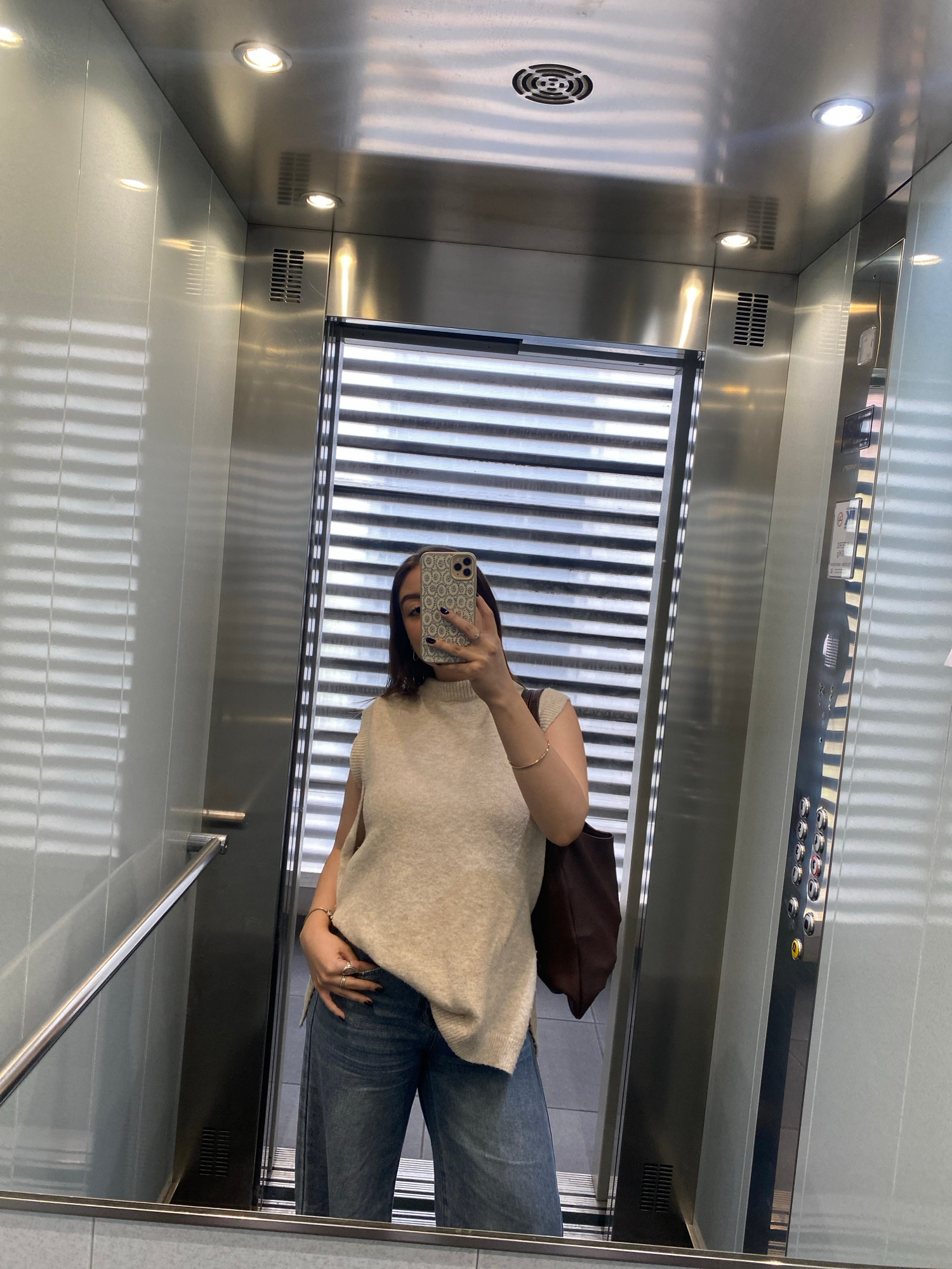 A woman is taking a selfie in an elevator. The elevator has a metal interior with vertical striped panels on the back wall. There are lights recessed into the ceiling and a control panel above the doo…read more