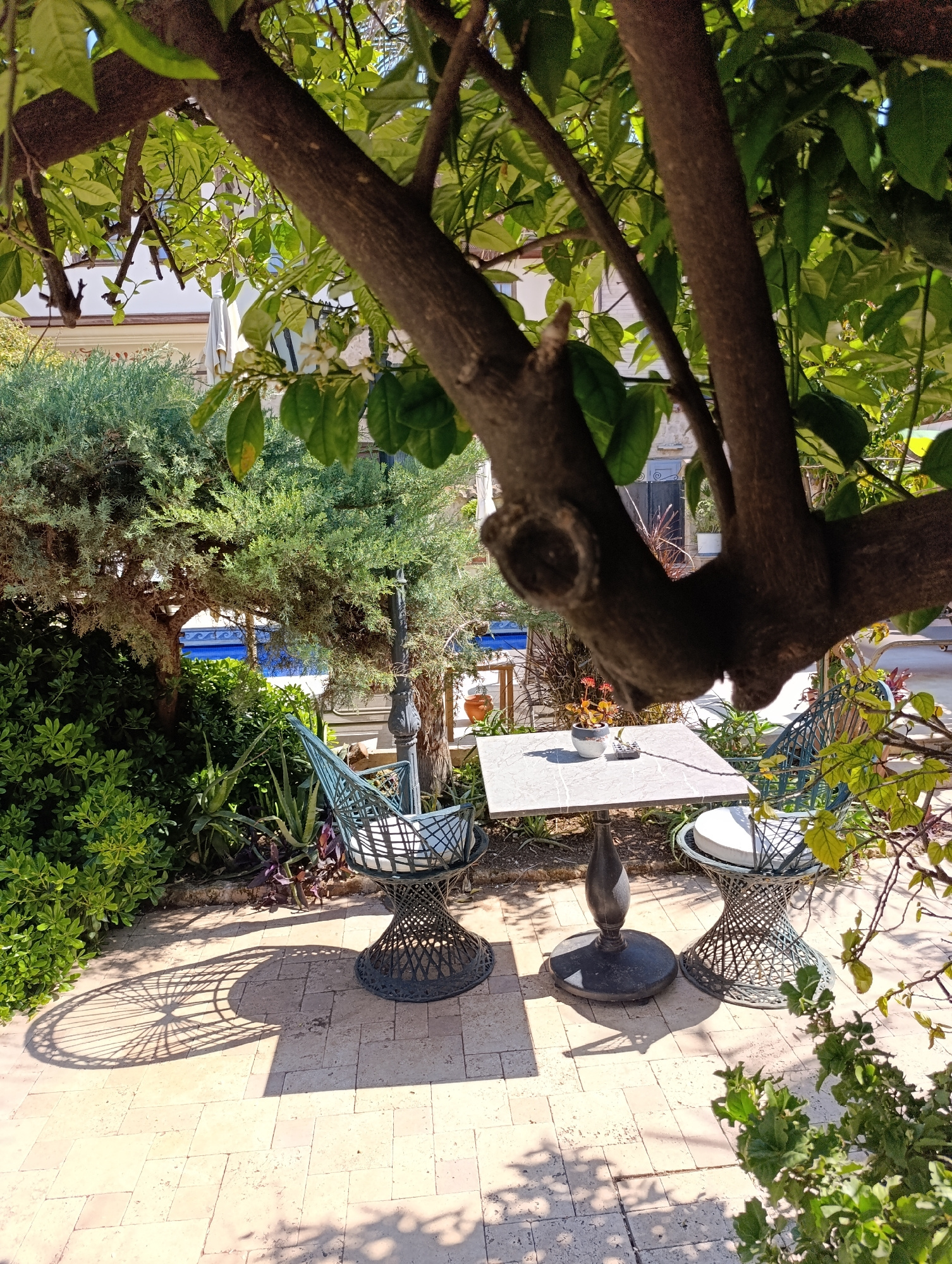 The image depicts an outdoor seating area, likely in Antalya, Turkey, characterized by natural elements and architectural details typical of the region. The scene is framed by a mature tree with a thiβ¦read more