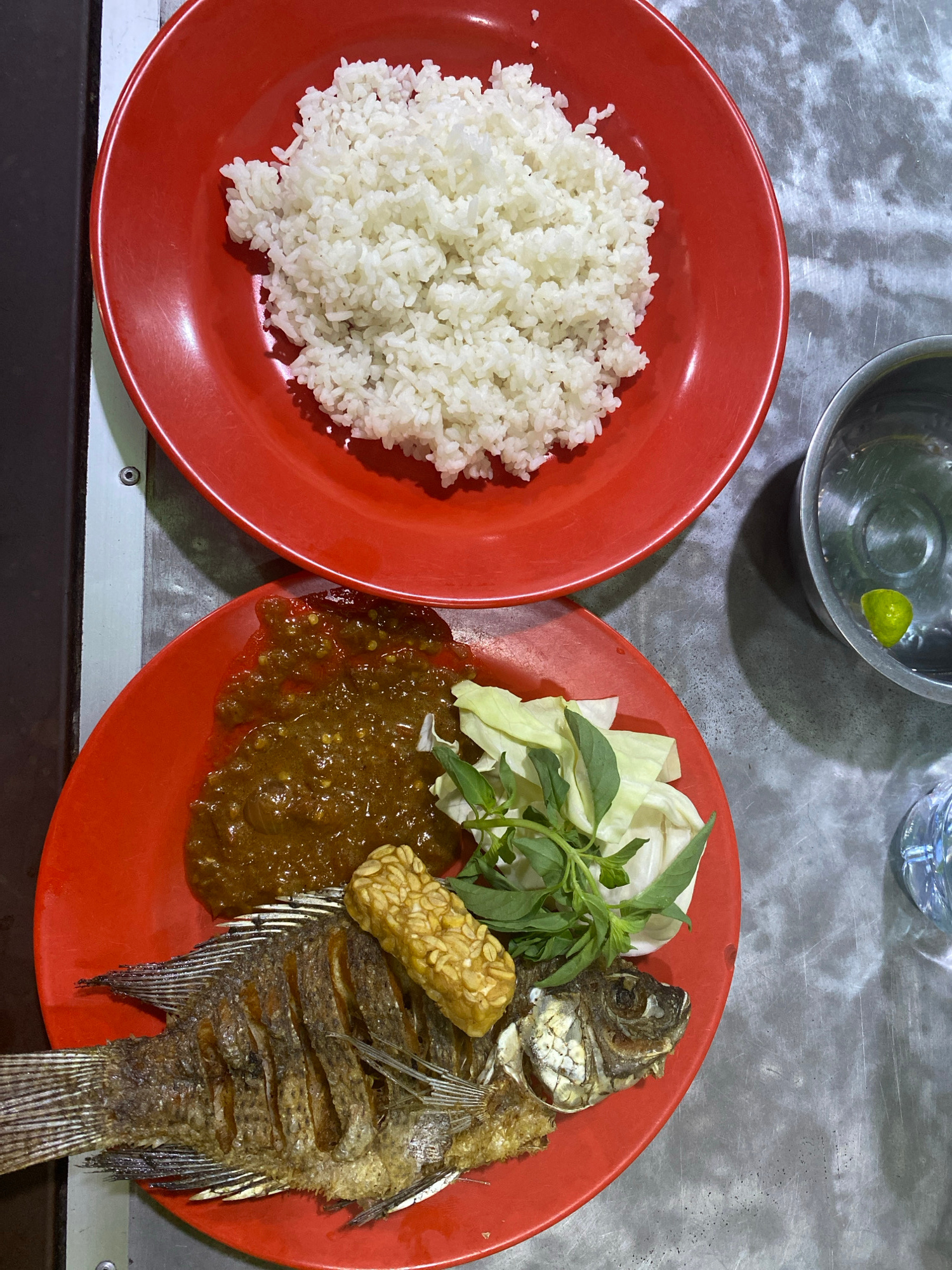 The image shows a meal, likely in North Kuta, Indonesia, given the cuisine. A red plate on the left contains a mound of white rice. Adjacent to it, also on a red plate, is a fried fish, a piece of tem…read more