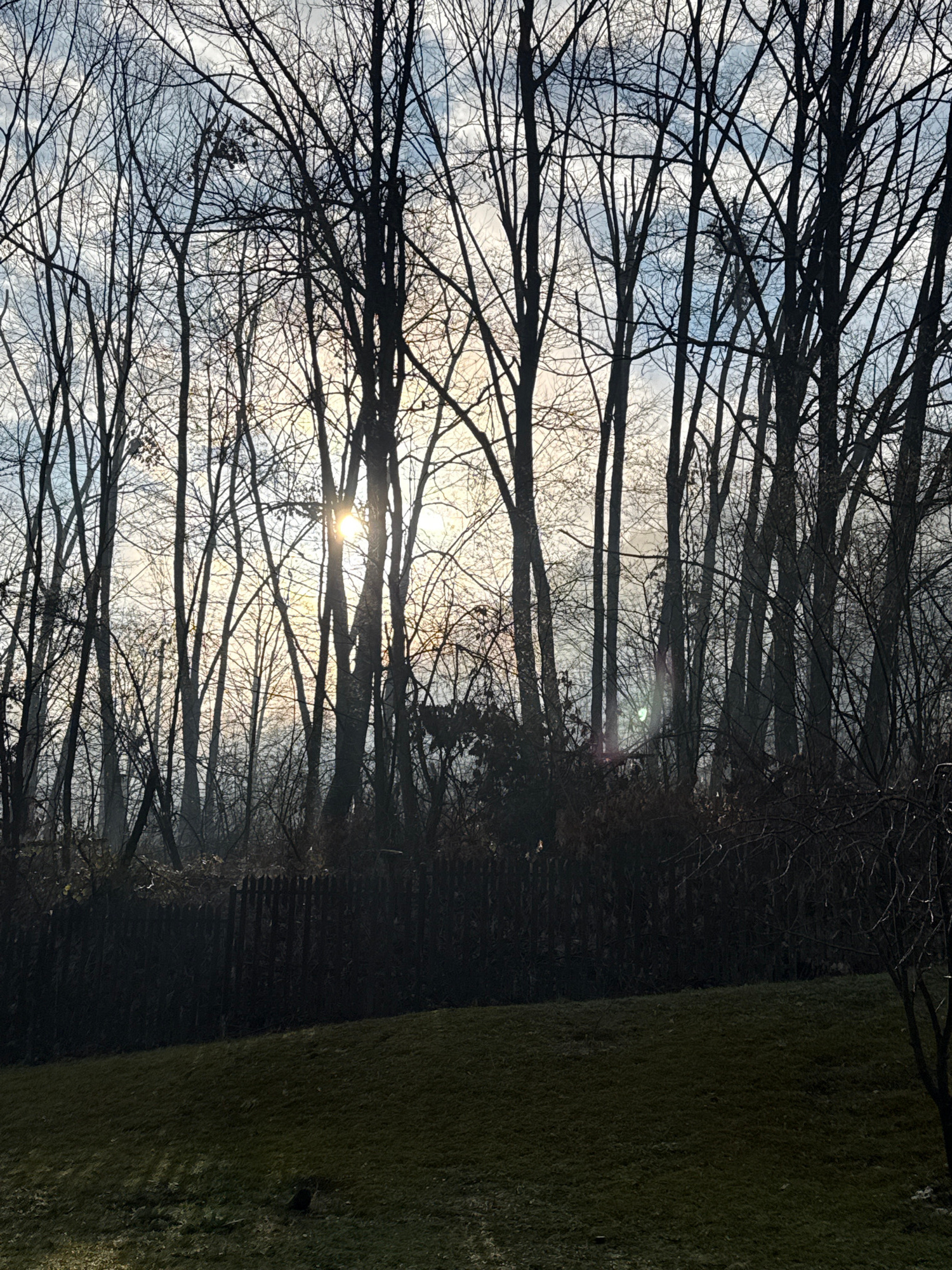 The image depicts a forest scene, likely in Etropole, Bulgaria. Bare tree branches dominate the foreground and midground, silhouetted against a pale, overcast sky. Sunlight filters through the brancheβ¦read more