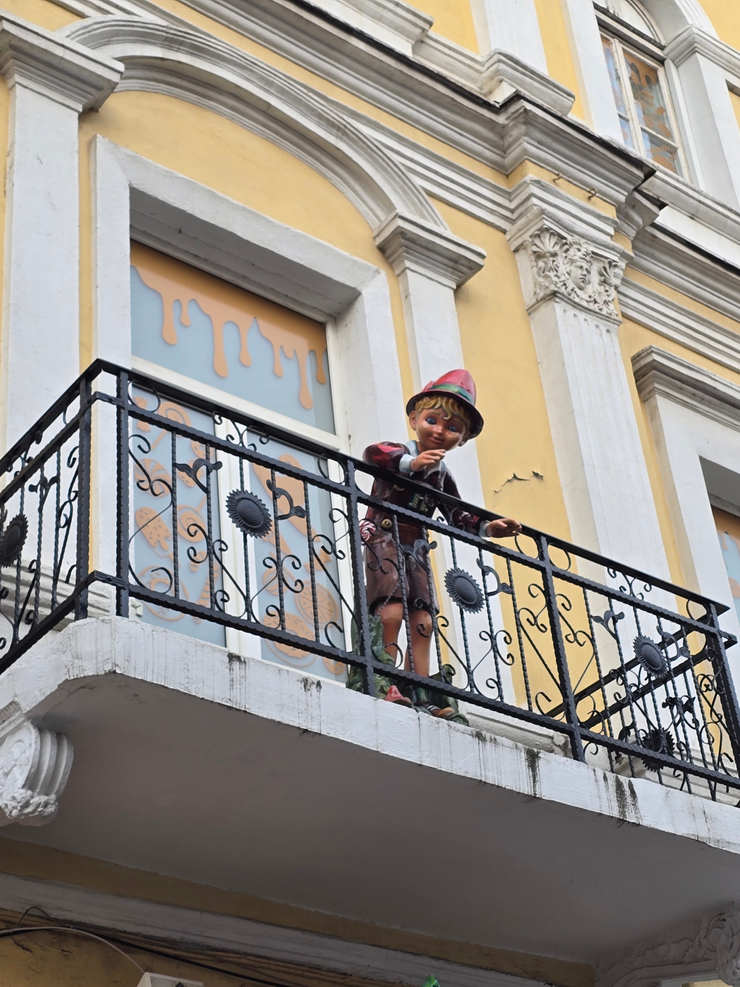 The image captures a decorative balcony on a building, likely in an urban setting. The building's facade is yellow with white trim and ornate architectural details around the windows. A black wrought-…read more