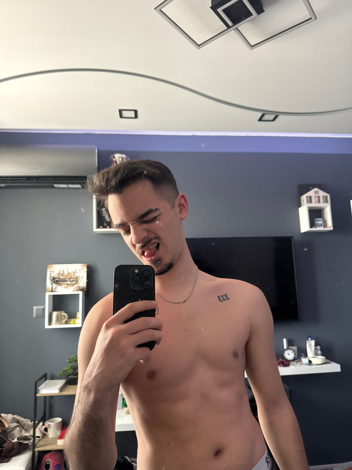 The image features a young man taking a mirror selfie. He is shirtless, displaying a small black tattoo of "333" on his left shoulder/chest area and a thin silver chain necklace. He has short dark hai…read more