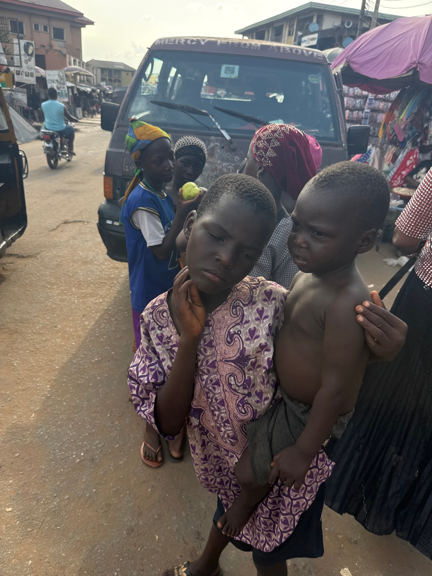 The image, taken in Onitsha, Nigeria, depicts a busy street scene, likely an outdoor market, during daylight hours under sunny conditions. In the foreground, a woman in a purple and white patterned d…read more