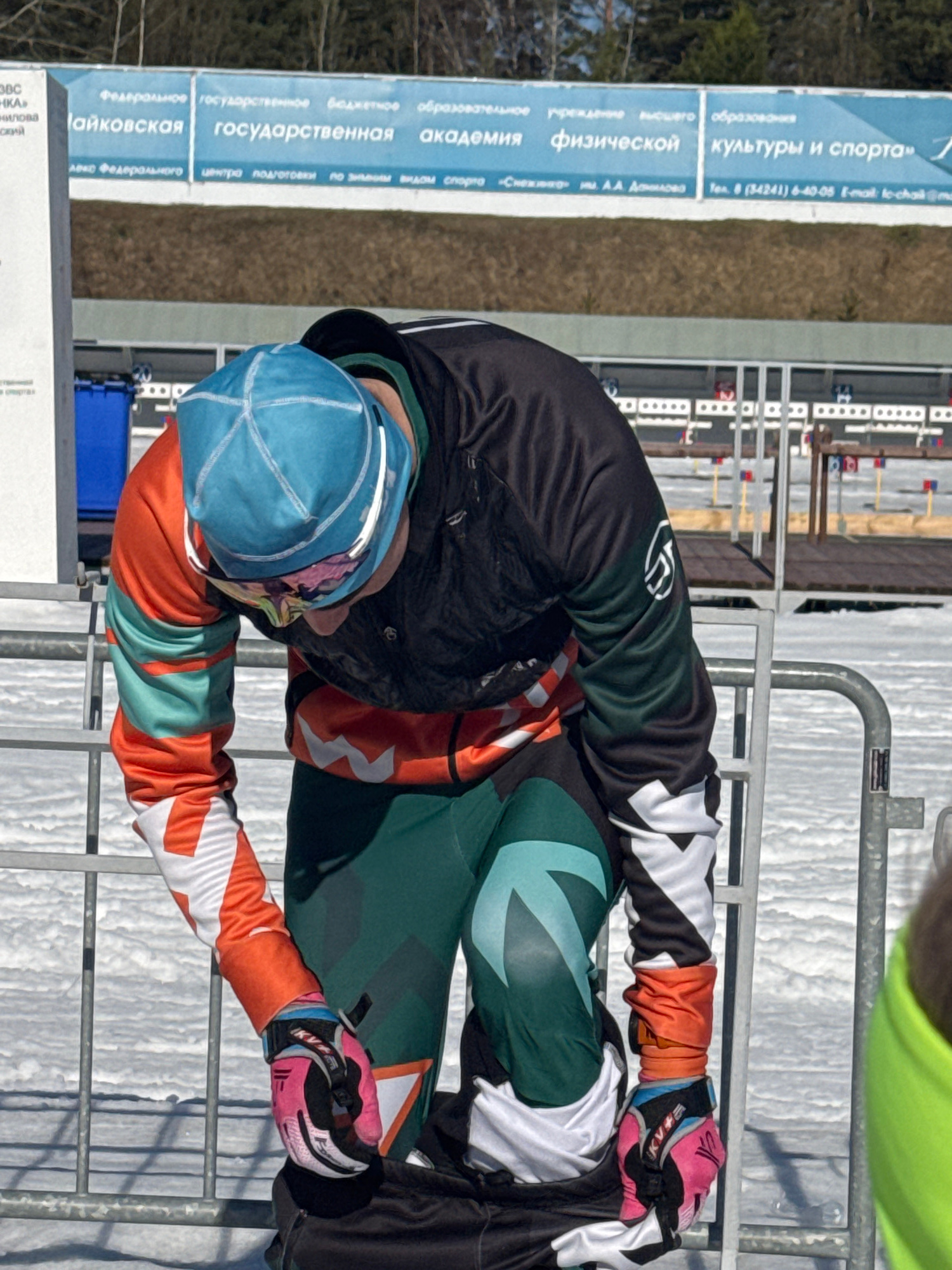 Here is a concise description of the image: A person dressed in athletic wear (green and orange with white accents), wearing a light blue cap, is seen leaning on a metal barrier in what appears to be…read more