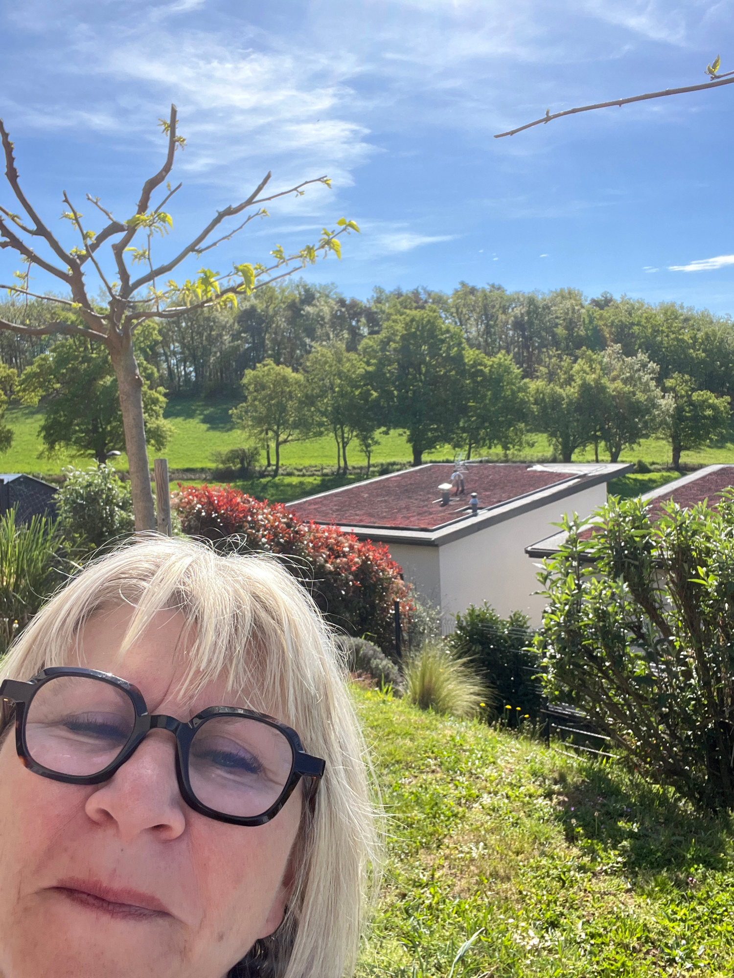 The image is a selfie taken outdoors in Chambœuf, France. It shows a woman with blonde hair and glasses in the foreground. The background consists of a house with a red roof, surrounded by green grass…read more