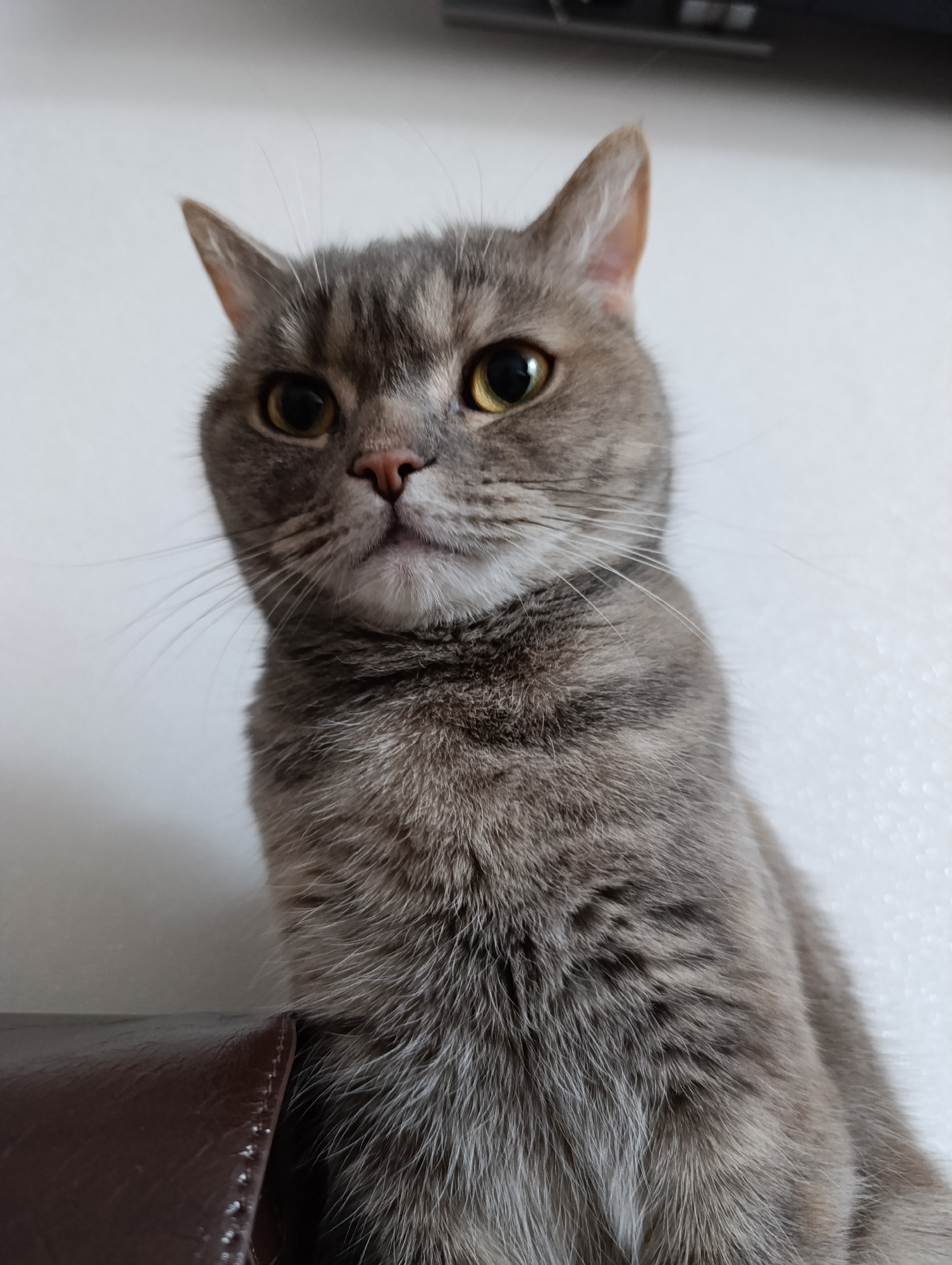A gray cat with yellow eyes and a pink nose is seated atop a brown leather object. The cat's fur is short and dense. The background is a plain white wall. The picture was taken inside in a location thβ¦read more