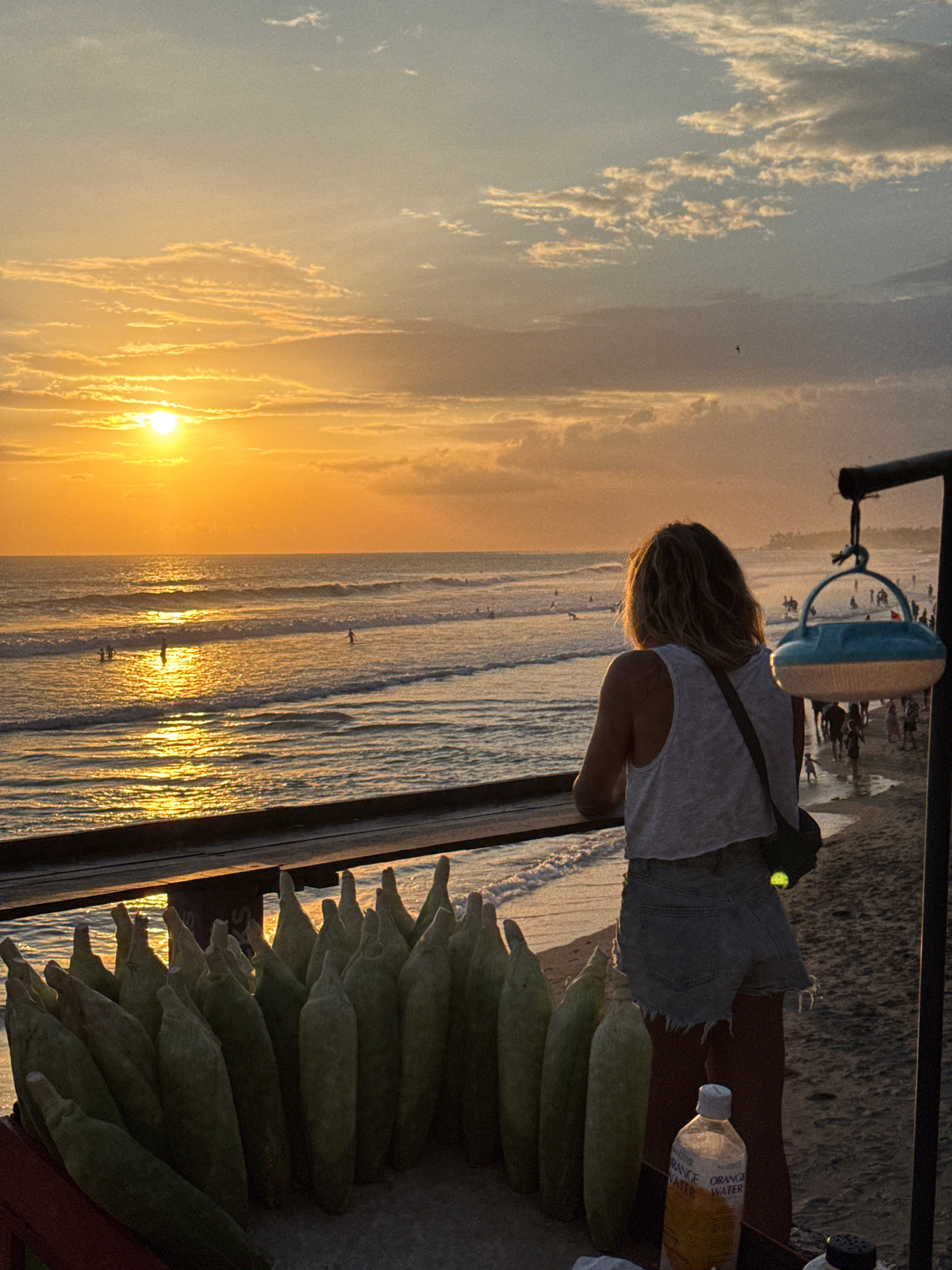 A sunlit view of the ocean at sunset in North Kuta, Indonesia features a woman gazing at the water. She is positioned beside a vendor's display of corn on the cob, with a water bottle nearby. The sky…read more