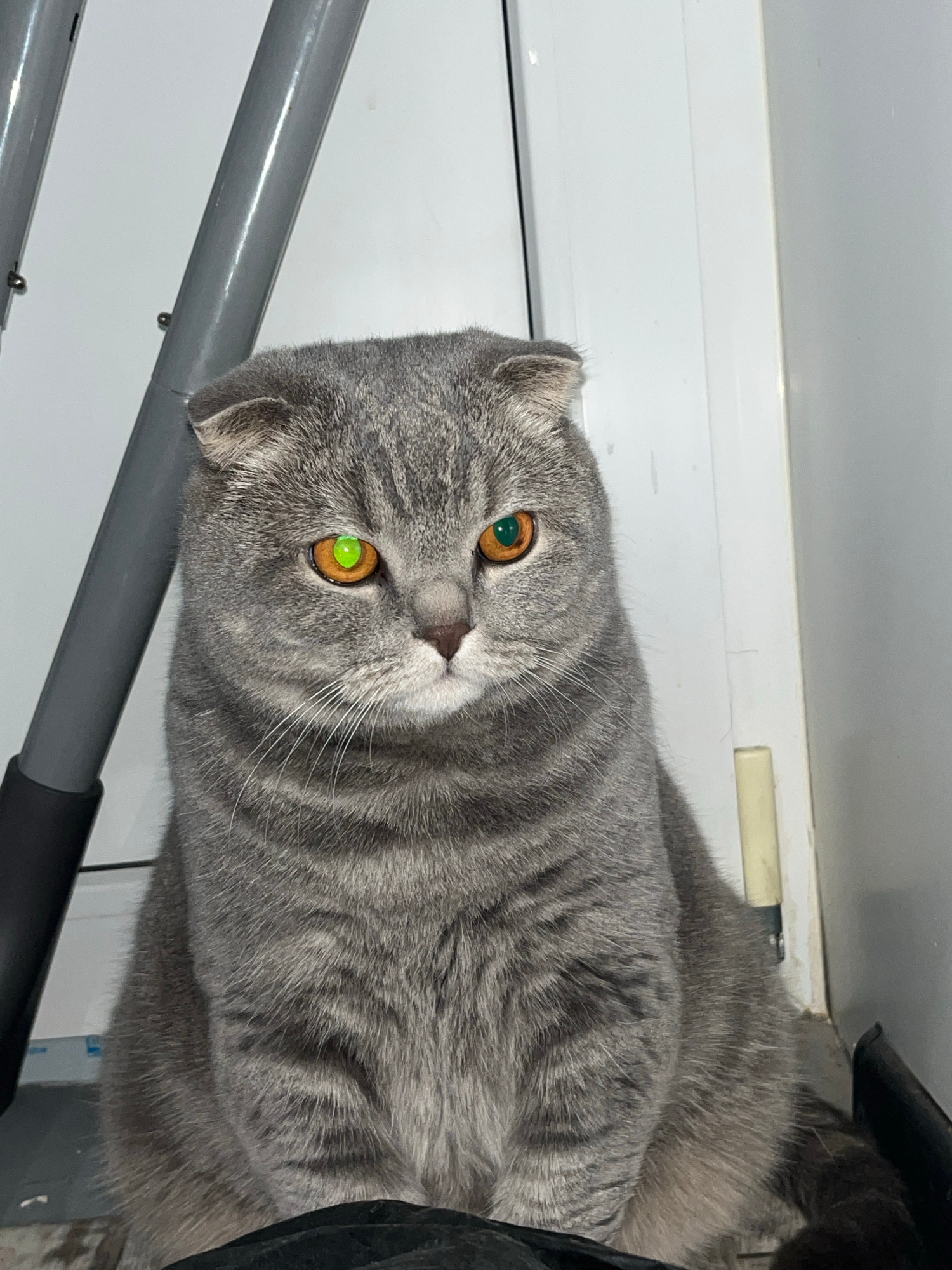 A grey, Scottish Fold cat is positioned close to the camera with its head tilted to the left. The cat has amber eyes, although the left one appears green due to a reflection. The cat has short, folded…read more