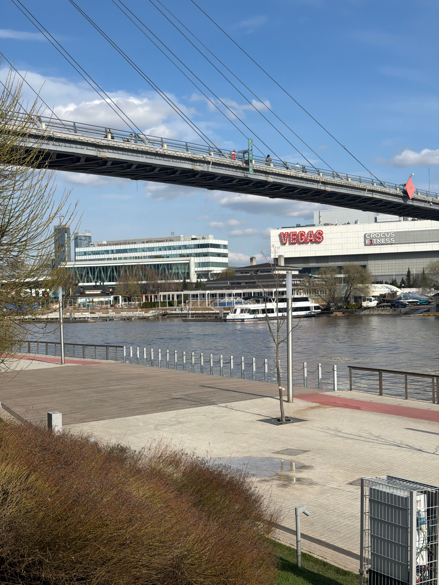 The image shows a view of the Moscow Canal in Khimki, Russia. A large bridge spans the canal in the upper left portion of the image. Adjacent to the canal are prominent buildings; one displays the wor…read more