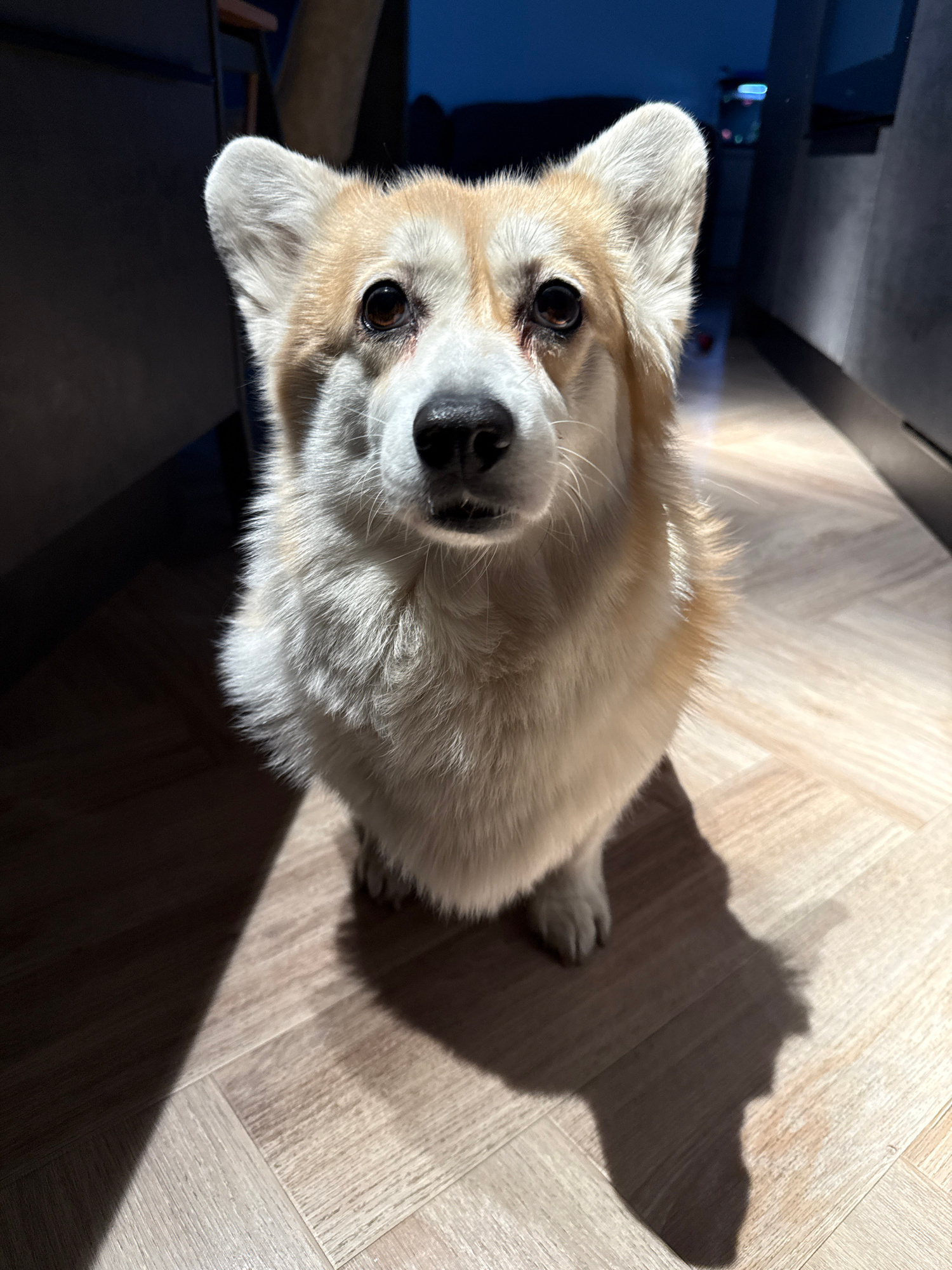 A dog, likely a Welsh Corgi, is positioned at the center of the frame looking upwards towards the camera. The dog is standing on a light-colored wooden floor. A dark shadow cast by the dog is visible…read more