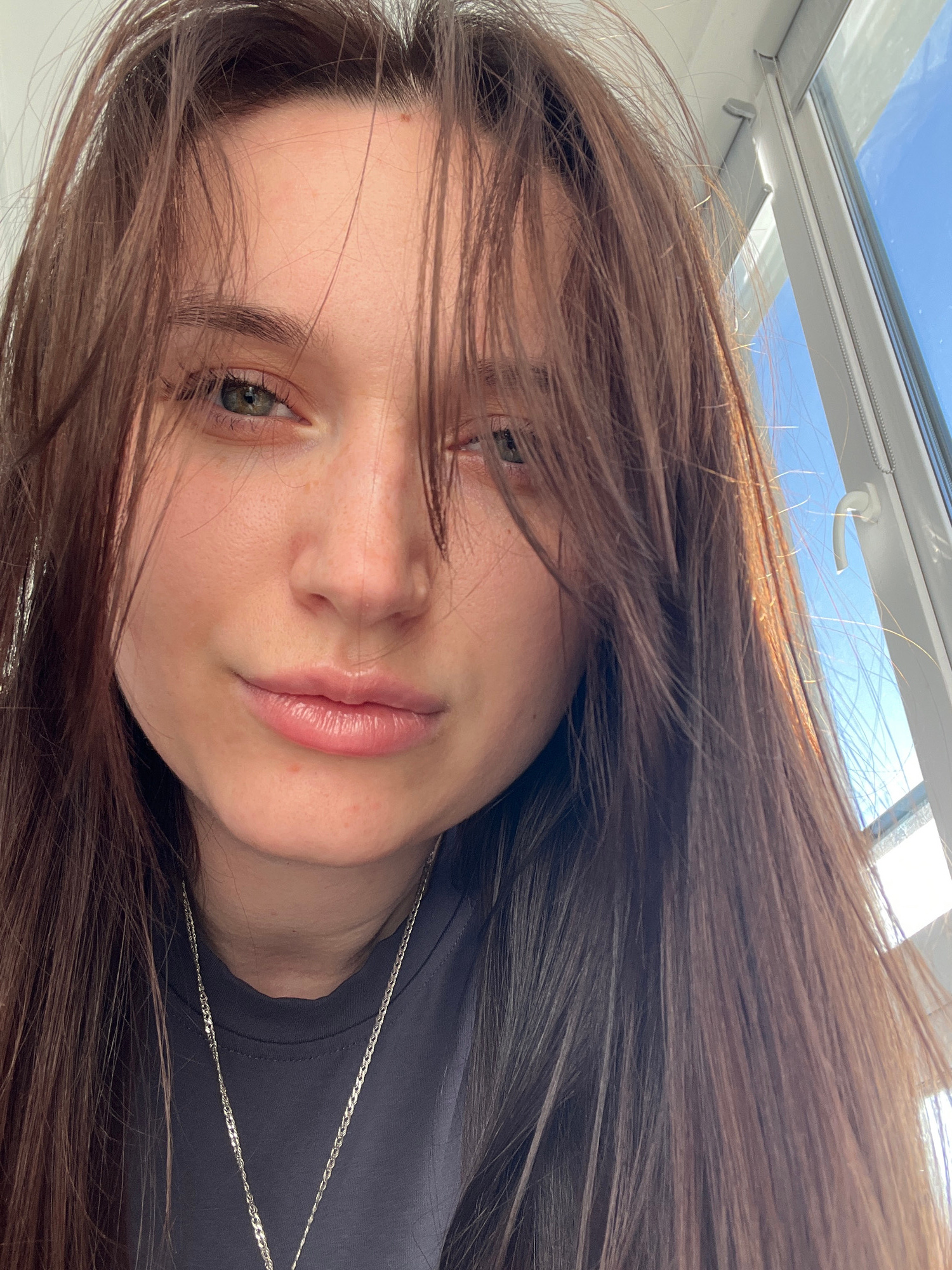 The image is a close-up, rotated portrait of a young person, likely female, with long, dark brown hair. The subject's head is tilted, and the image is oriented horizontally, giving the impression of t…read more