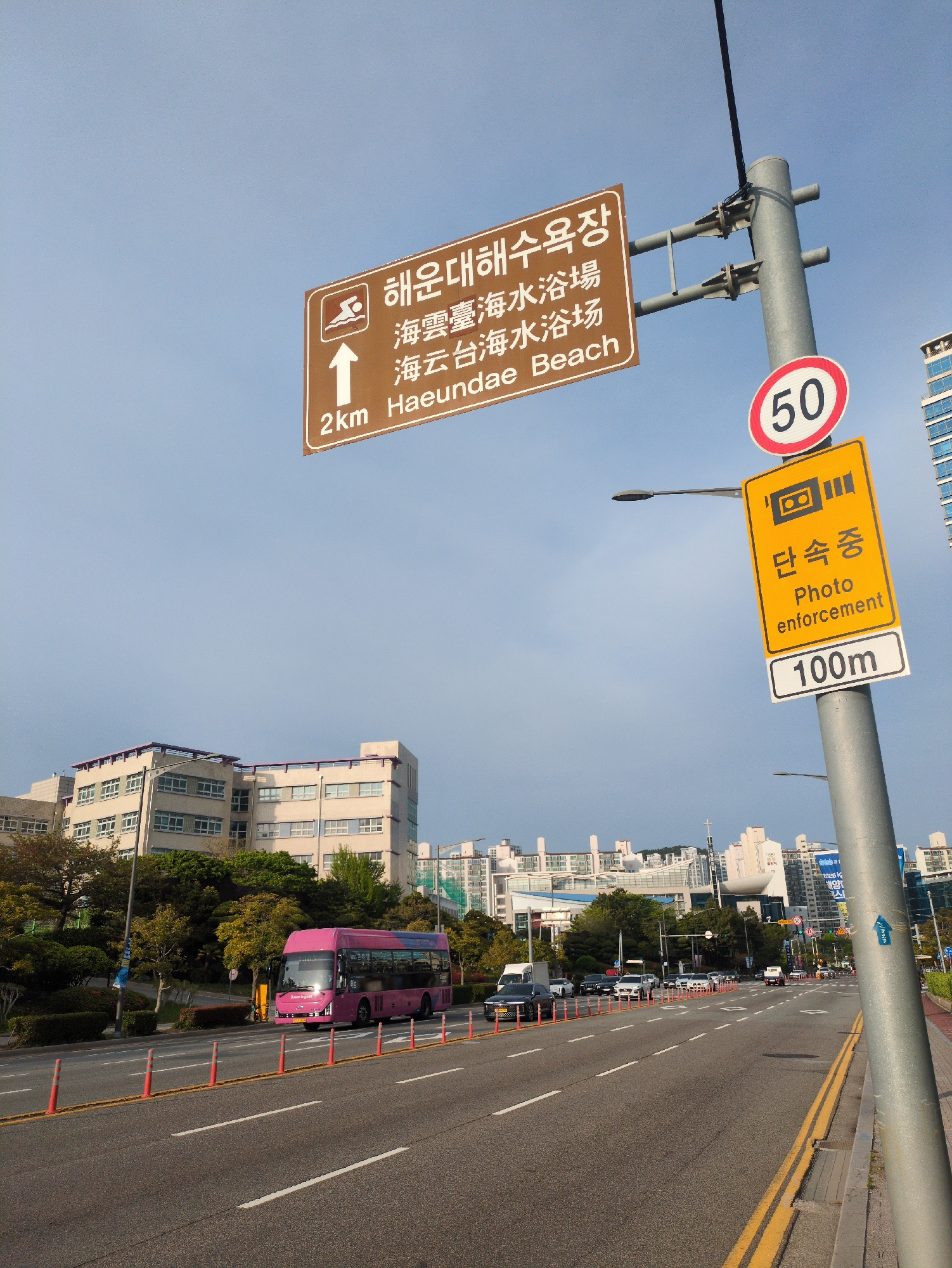 The image depicts a street scene in Busan, South Korea. A roadway with double yellow lines runs along the right side. A pink tour bus is on the road. A metal pole supports a series of signs: a brown…read more