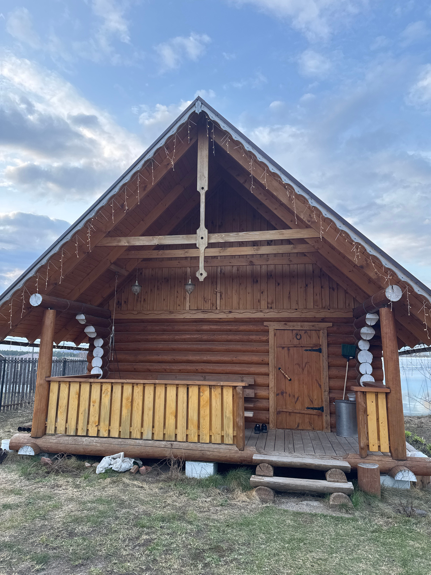 The image displays a rustic, wooden cabin or bathhouse, likely situated in a rural area like Гаревая, Russia. The structure is constructed from natural logs and planks, featuring a prominent gabled ro…read more
