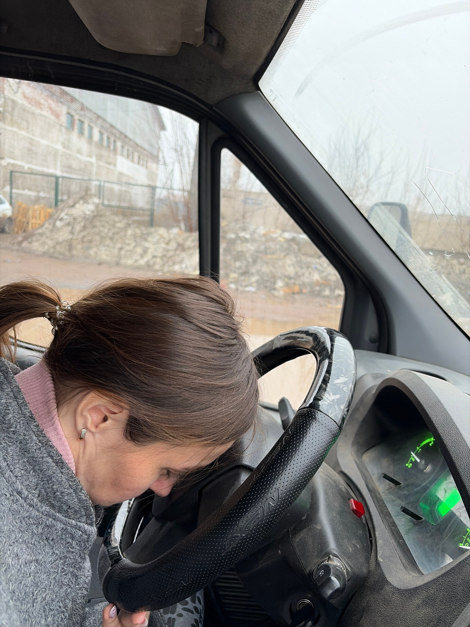 A woman with brown hair pulled back in a ponytail is seen inside the cab of a vehicle. Her head is leaning against the steering wheel. The vehicle's dashboard and window are visible. The outside scene…read more