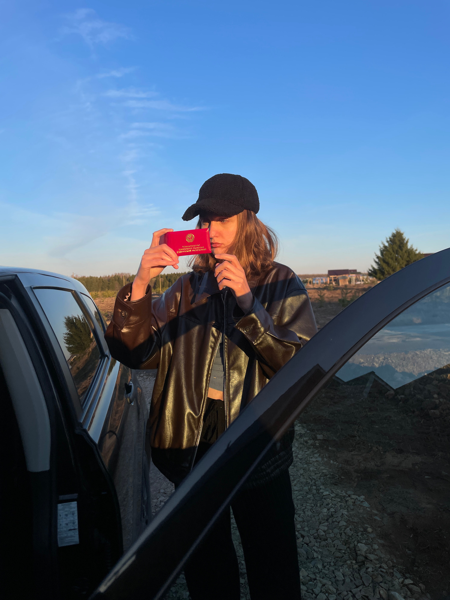 A young person with long brown hair, wearing a black newsboy cap and a dark brown faux leather jacket, stands next to a dark-colored car with its trunk or rear door open. They are holding a red docume…read more