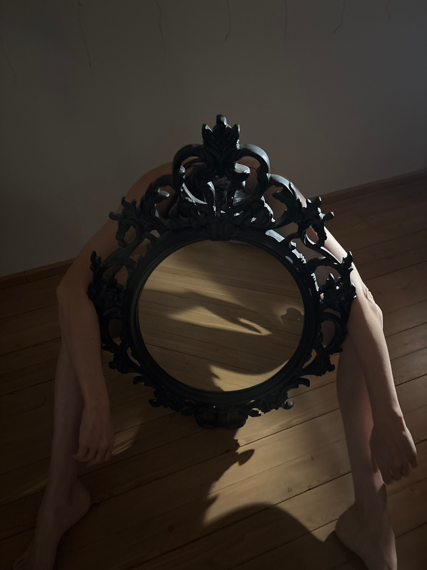 A low-angle shot depicts a person obscured behind a black, ornate, circular mirror lying on a wooden floor. The person's arms and legs extend from behind the mirror's edges. The scene is partially lit…read more